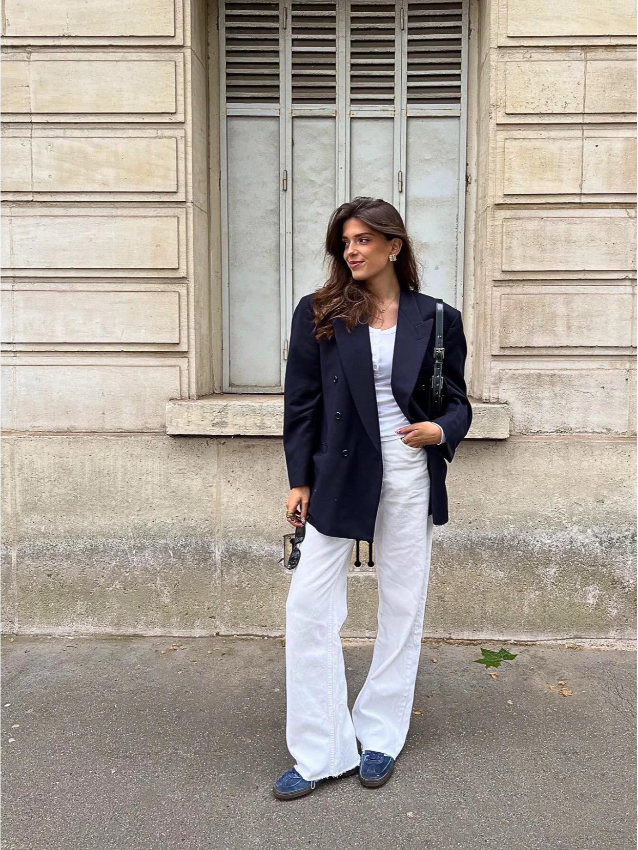 寬鬆的小廓形西服外套,搭配白色小背心、直筒褲,是一種簡潔清爽的美。穿不膩的黑白配,作爲通勤穿搭,也是簡潔出彩的。