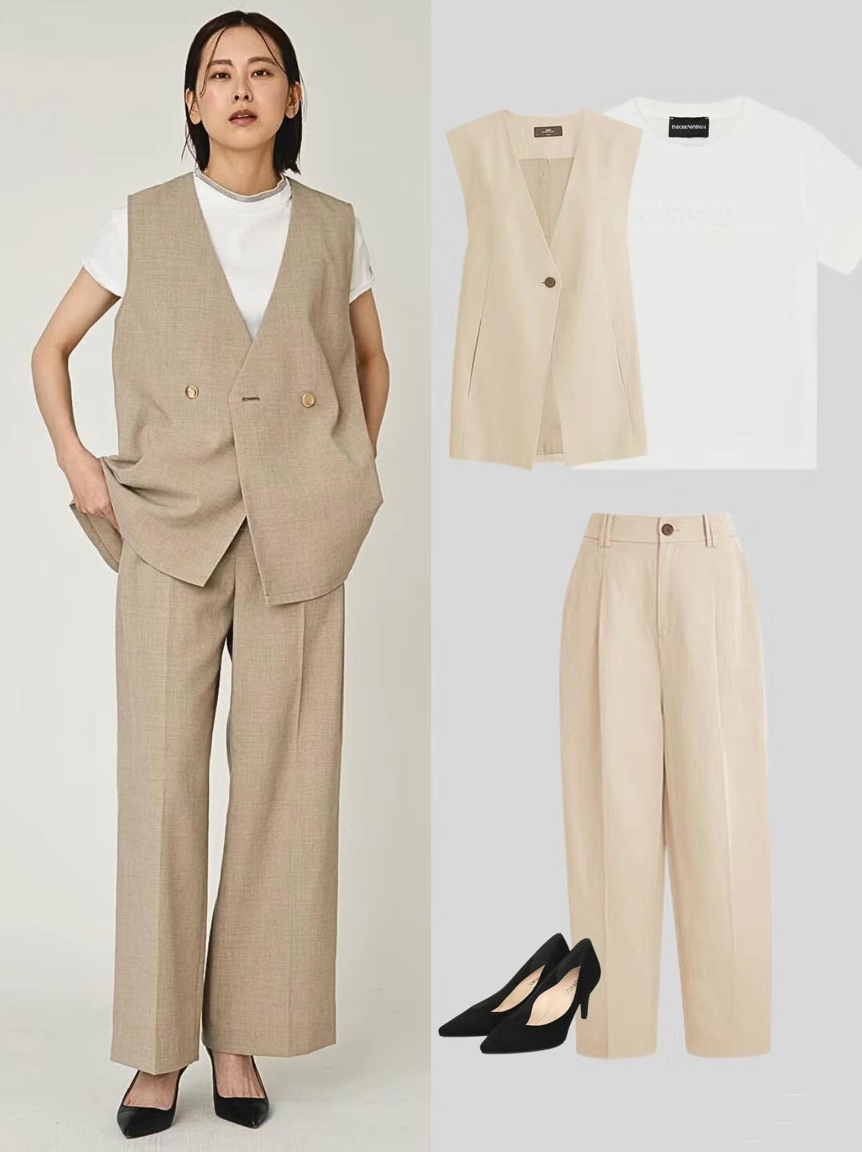 簡單又別緻的穿搭,總是讓人驚喜。寬鬆馬甲配上同寬西褲,內搭白色T恤,有一種更溫柔知性的力量。