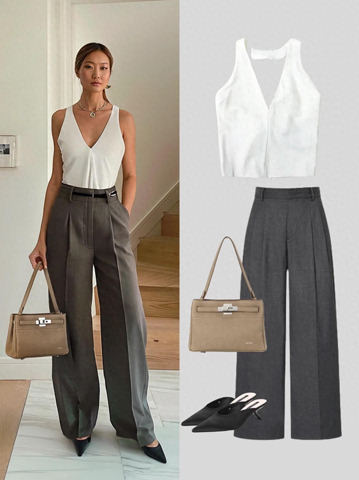 簡潔清爽,夏日氛圍拉滿也很利落。白色V領背心,小露背的設計帶幾分熱辣,配深灰色西裝闊腿褲,酷颯又提氣場。一雙尖頭的穆勒鞋,搭配小高跟的設計,時髦洋氣還提氣質。