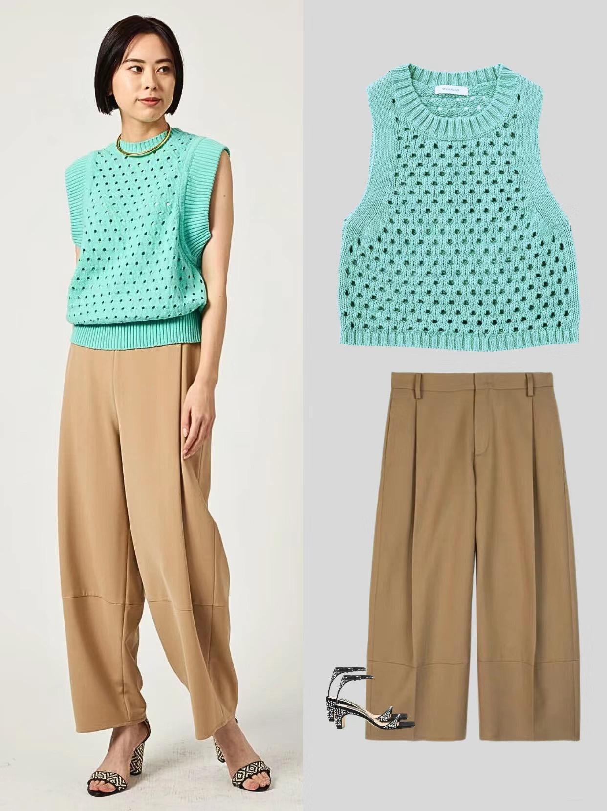 偶爾想要溫柔一點,就穿淺色系的針織背心吧。鏤空點綴的針織背心,配上卡其色的長褲,簡單清爽還很減齡。