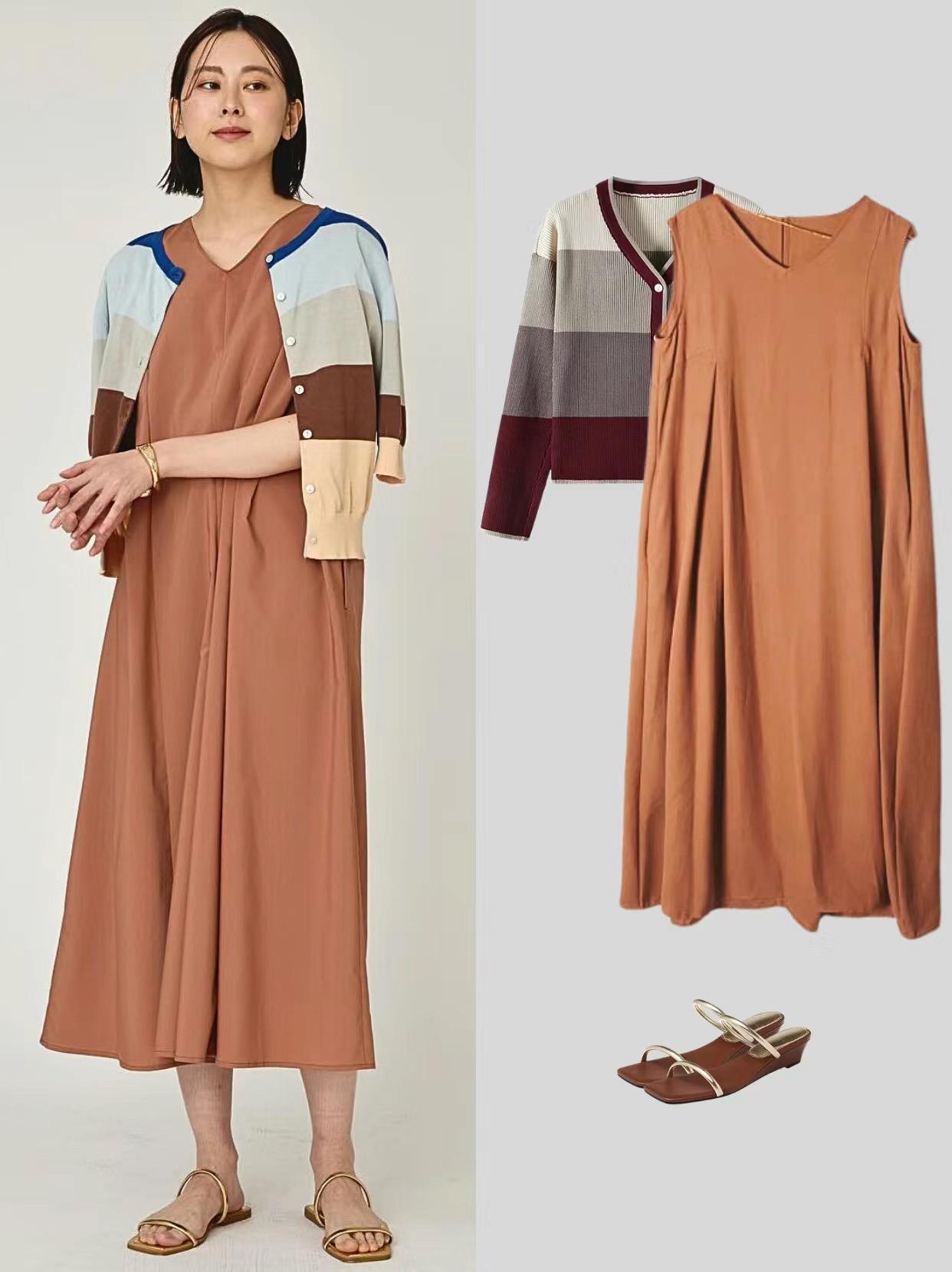 優雅的大地色連衣裙,適當寬鬆的版型、穿起來也是舒適又自在,配上條紋的臨近色針織開衫,有一種知性優雅的魅力。