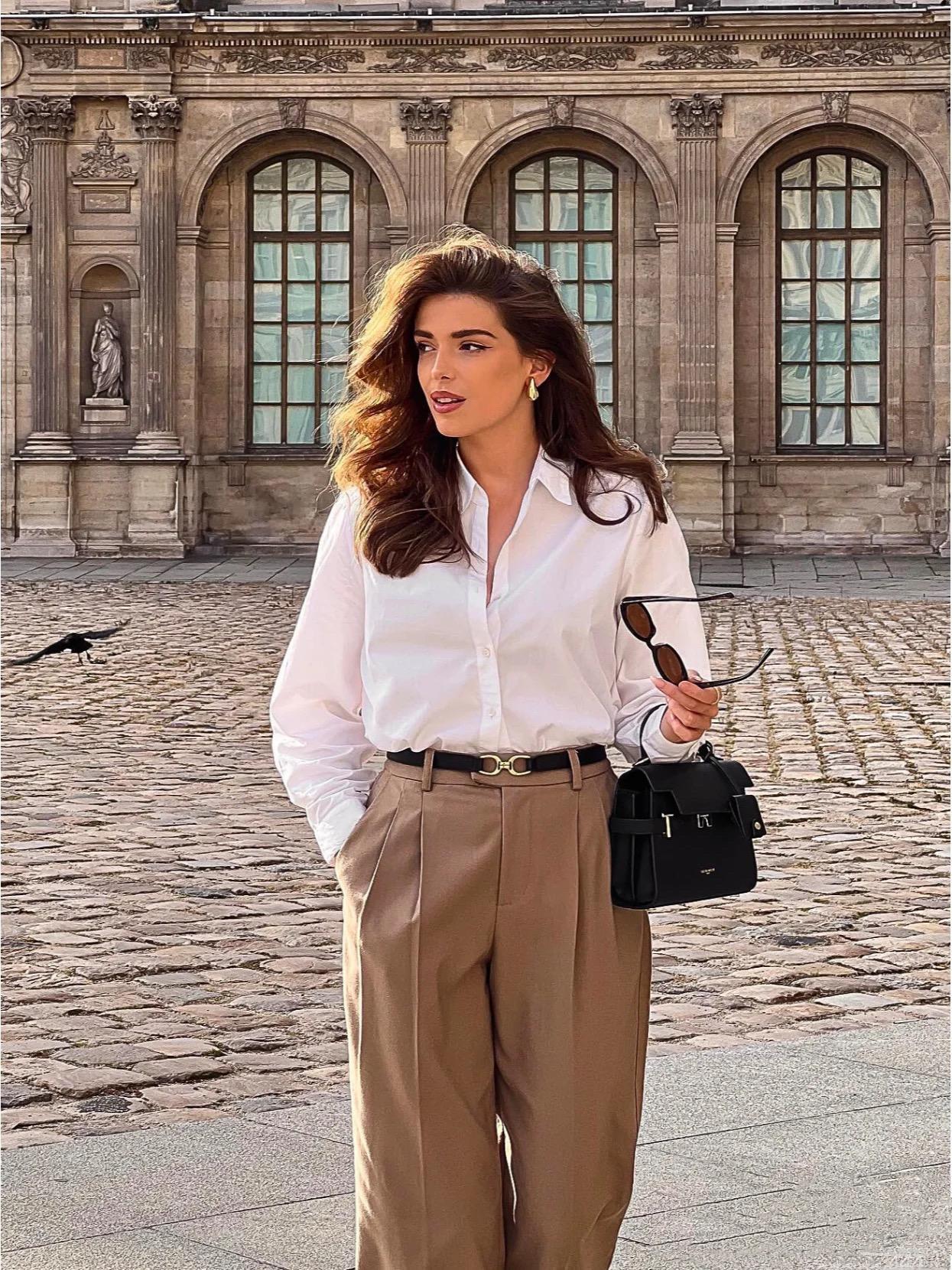 白襯衫、西裝褲,總是擁有別樣的魅力。極簡風的白襯衫,撞上卡其色的西裝褲,波浪卷的頭髮,輕鬆get到大女人的氣場。