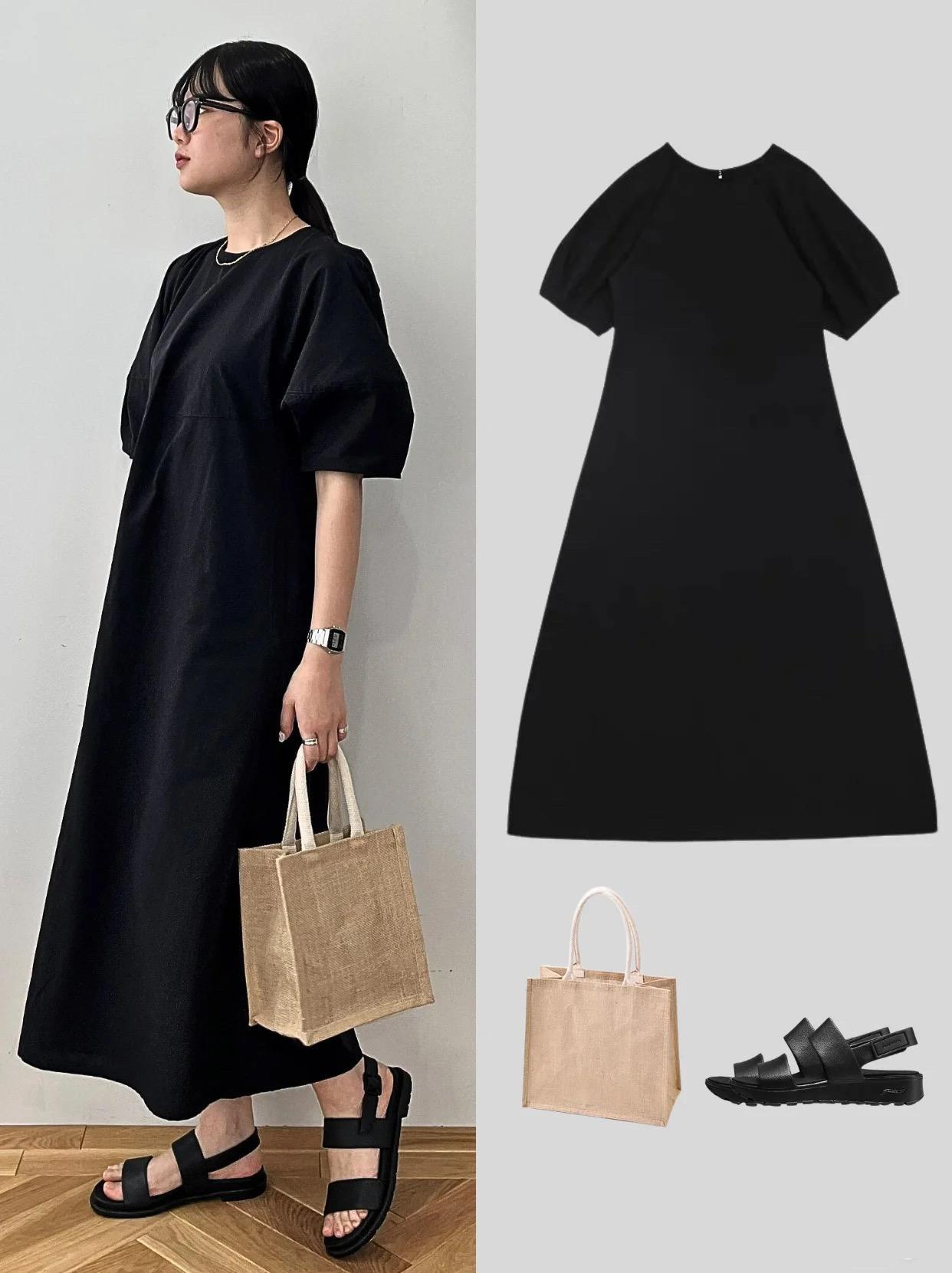 黑色連衣裙,以寬鬆的泡泡袖、高收腰的設計,贏得大衆的青睞。適當寬鬆的A字形連衣裙,屬於一種不挑身材的單品,上班通勤配黑色涼鞋就很清爽。
