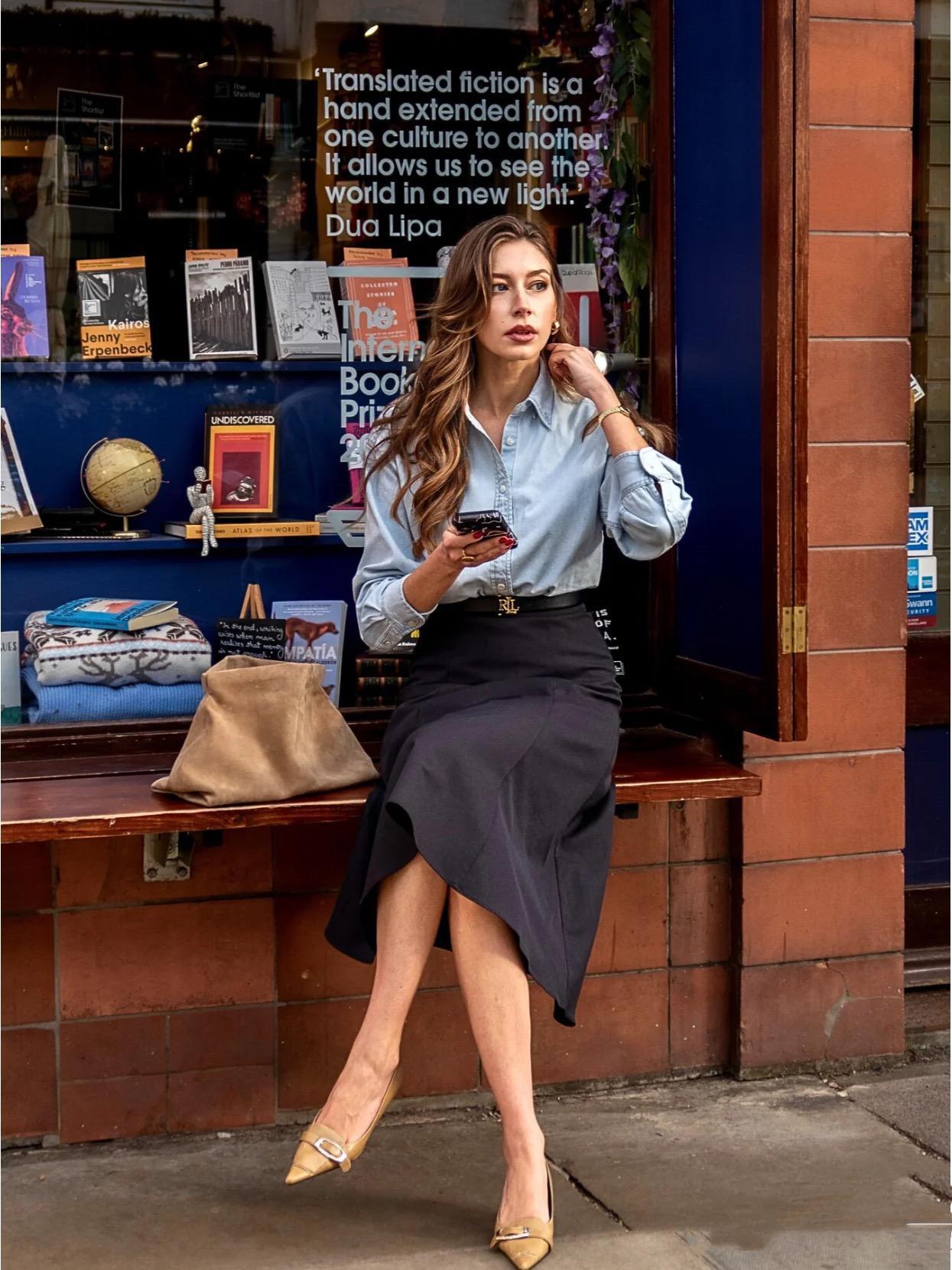 淺藍色牛仔襯衫,高腰的A字形半身裙,腰部收緊的剪裁,既大方又有女人味。上班通勤,還是尖頭高跟鞋更提氣場,與服裝的適配度也更強。