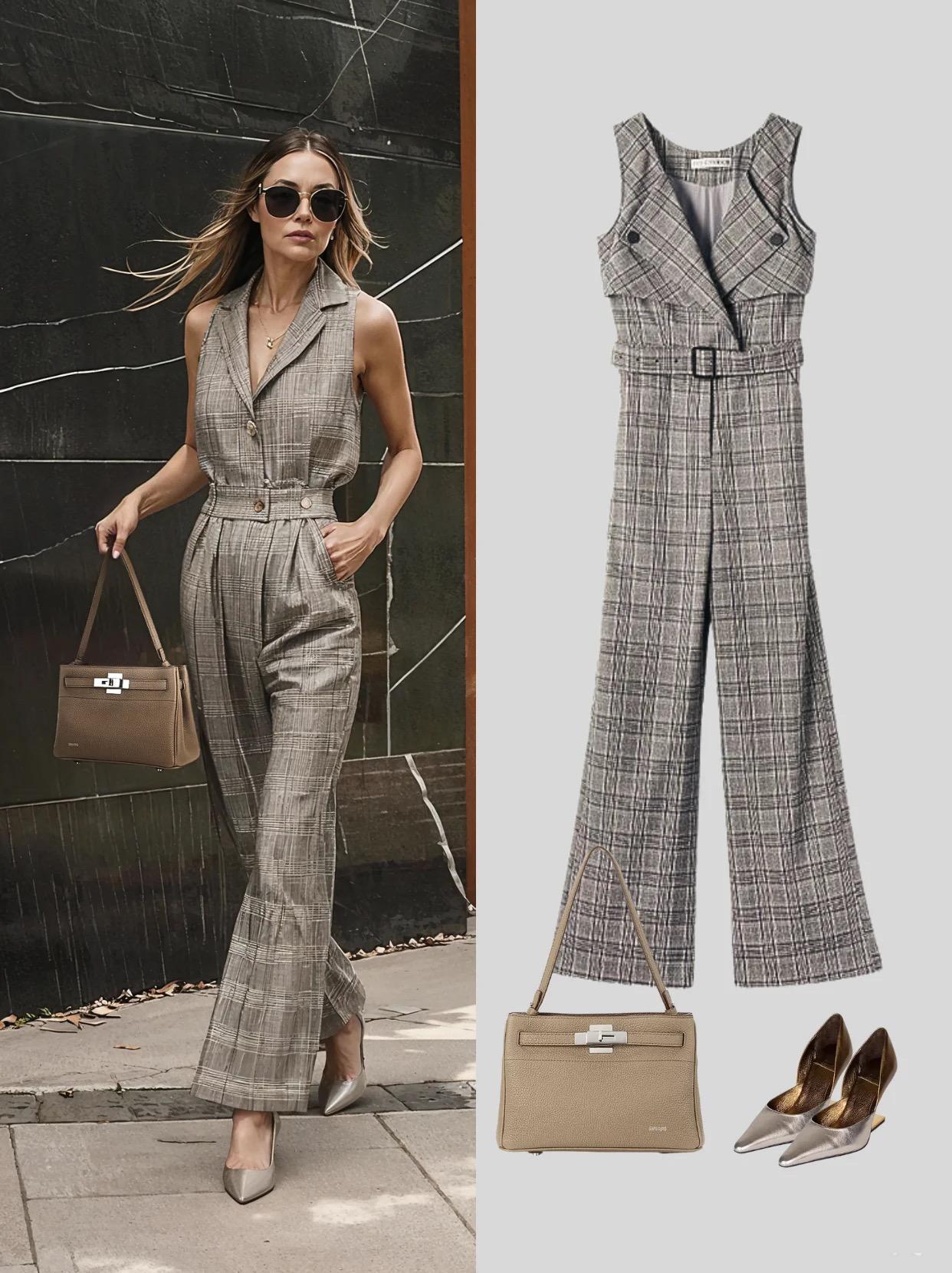 這種格紋連體褲,配上高收腰的設計就格外的顯腿長,搭配一雙尖頭的高跟鞋、瞬間有了時髦摩登的氣場。
