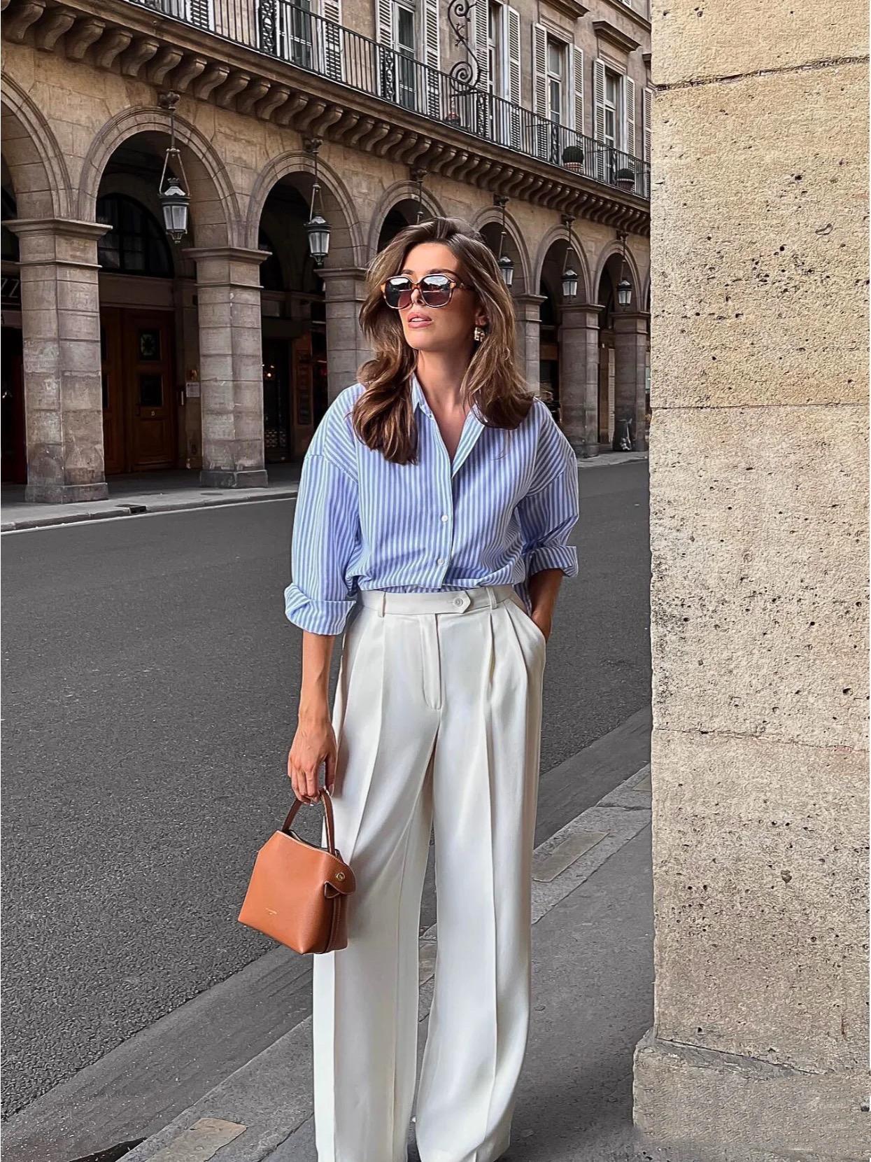 條紋襯衫,白色西裝褲,藍白配色好是清新。看似基礎的穿搭,憑藉條紋元素、卷邊的衣袖,輕鬆美出圈。條紋襯衫爲夏日通勤穿搭,帶來無限風采。