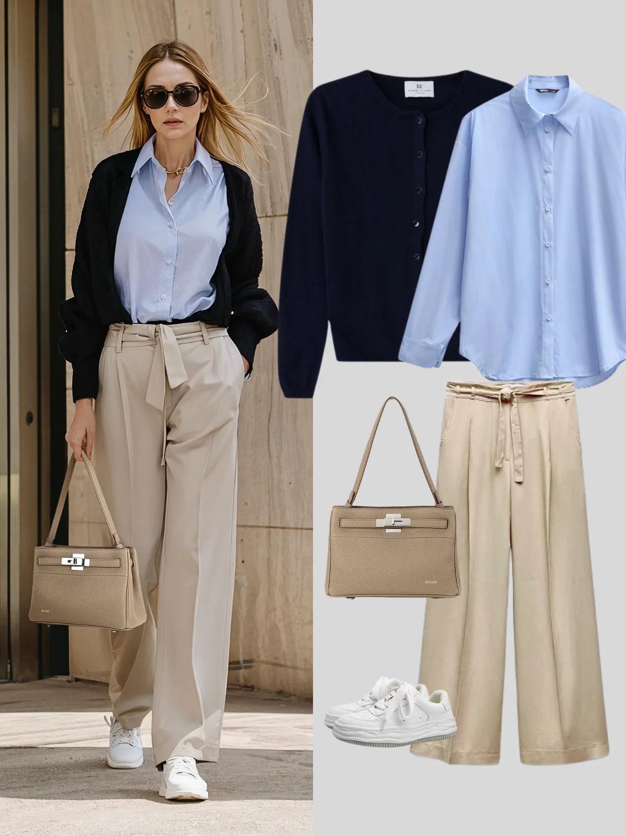 溫柔又清爽的配色,總是給人一種很大氣的美。像這種淺藍色襯衫,可以配杏色西裝褲,通勤上班最是雅緻,也彰顯獨特的品味。