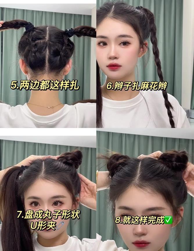 5-8.兩邊都是一樣的扎法,辮子編成麻花辮的樣子就行,然後再將其盤成丸子的形狀,用u形夾固定。