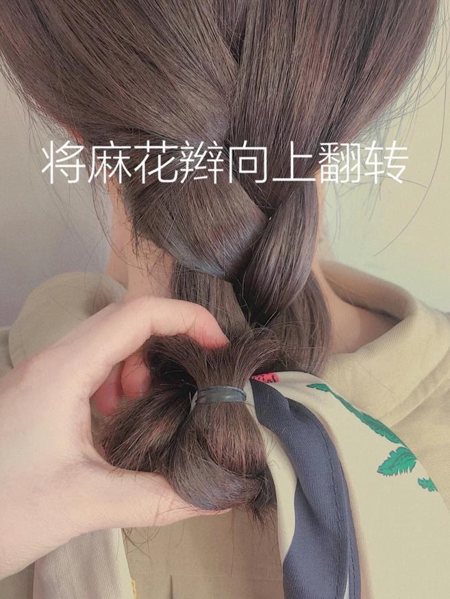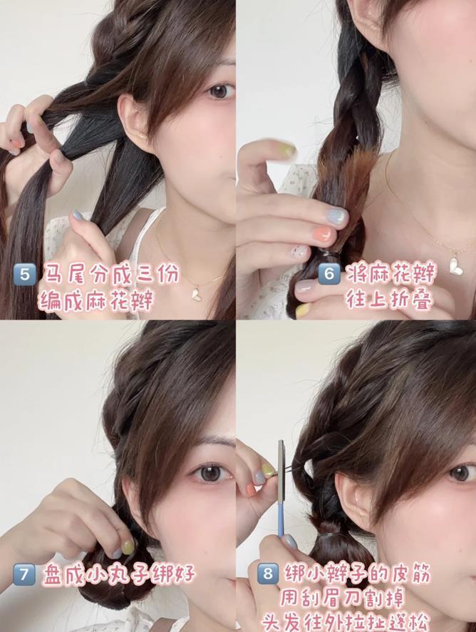 5-8.馬尾處的頭髮也分成三份,繼續編成麻花辮,將麻花辮往上進行摺疊起來,盤成一個小丸子綁好。耳邊綁小辮子的皮筋用剪刀剪開,用手往外拉扯出蓬鬆感。