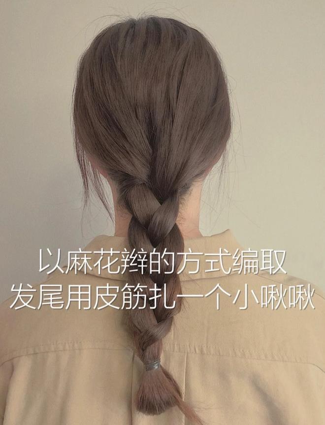 2. 之後以麻花辮的方式進行編織,編到髮尾的時候,用一個小皮筋扎一個小啾啾。