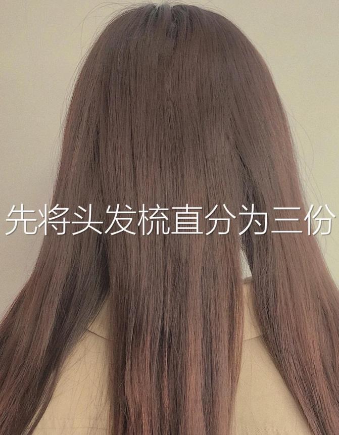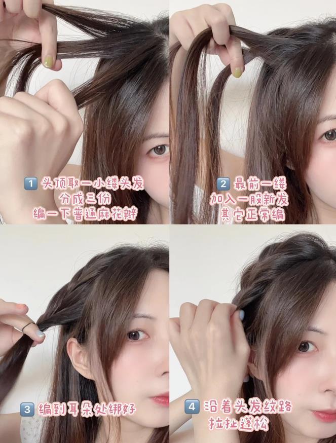1-4.首先在頭頂處取出一小縷的頭髮,並且將起分成三份,然後編成普通的麻花辮樣式,最前面的一縷頭髮加入新的頭髮,其他就正常編。