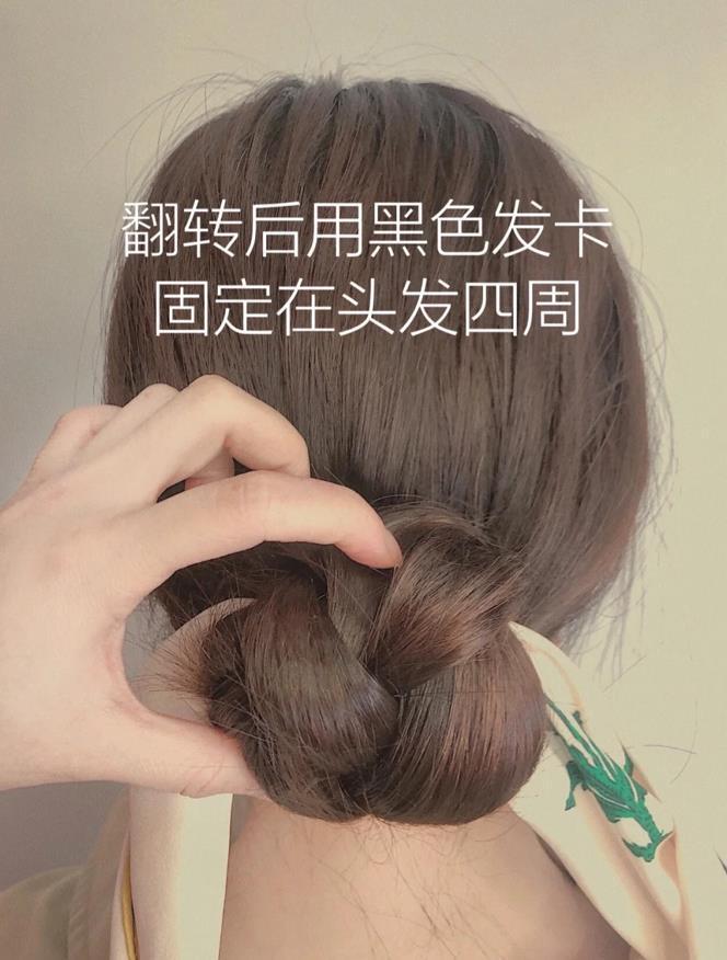 5. 翻轉後就用黑色的髮夾將其固定在頭髮的四周。