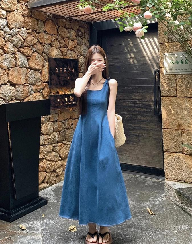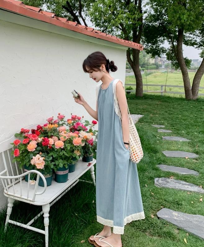 慵懶又顯瘦的一條牛仔無袖連衣裙,寬鬆的版型加持下,穿得可藏肉顯瘦了,及踝的長度,穿起來也不會拉低個子,在視覺上也顯高挑。選擇一雙夾趾平底涼鞋來配,可太舒適自在了。