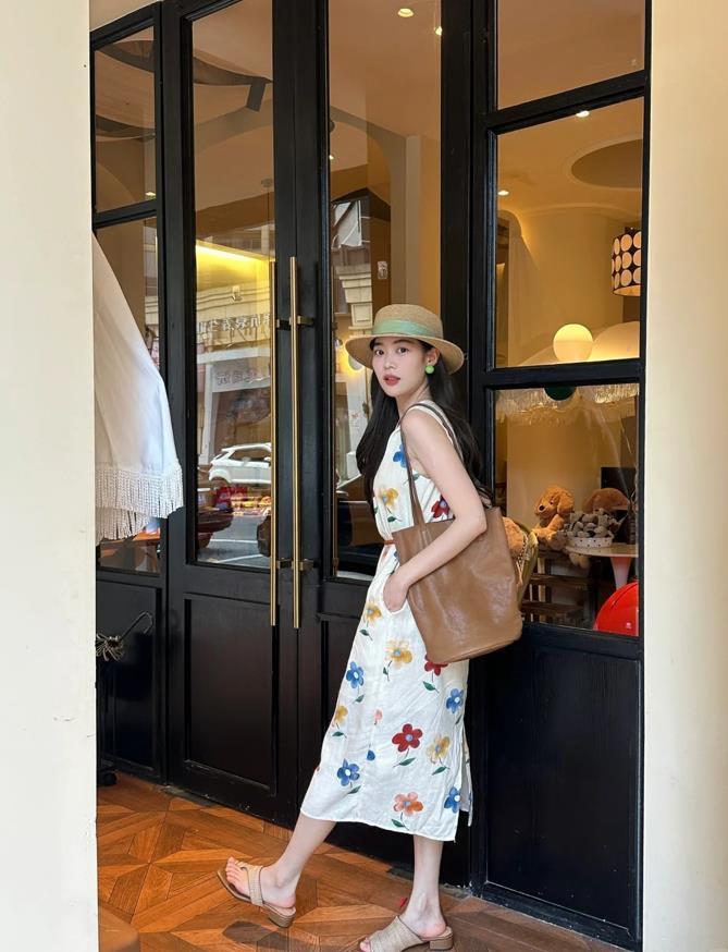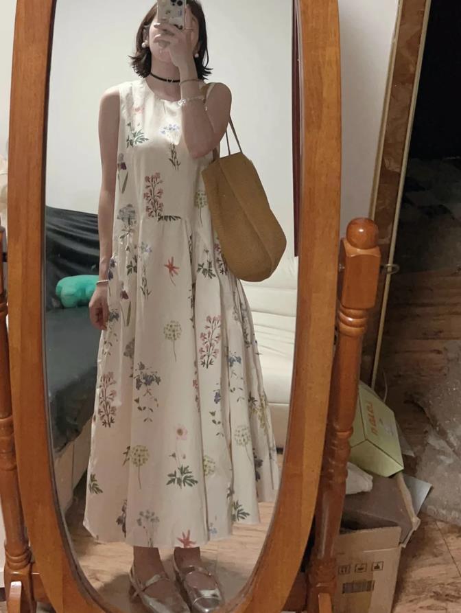 如果你覺得密密麻麻的碎花連衣裙,看起來有些顯俗氣的話,可以選擇這種印花布局沒有那麼密集的,無袖的款式,正適合夏天穿呢,很清爽涼快,又充滿氣質感。腳下踩着一雙涼拖鞋,可太舒適自在了。