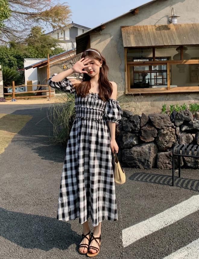 很適合夏日的格子連衣裙,輕鬆就能get洋氣的造型,經典的黑白格子,加上露肩和泡泡袖的設計,一秒打造出甜美減齡的造型。選擇一雙平底涼鞋來配,舒適極了。