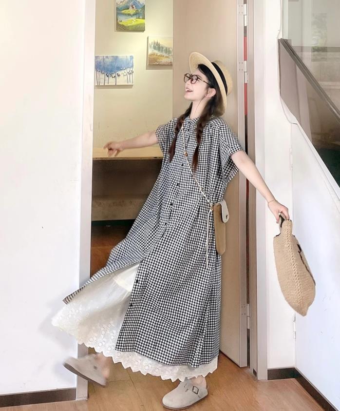 日森系風格的一條格子連衣裙,棉麻材質,夏天穿這種面料透氣性極佳的,舒適度也是非常不錯的。喜歡裙子寬鬆的版型,最藏肉顯瘦了,裏面還疊穿了一條白色半身裙,裙子+裙子的疊穿,太出挑了。