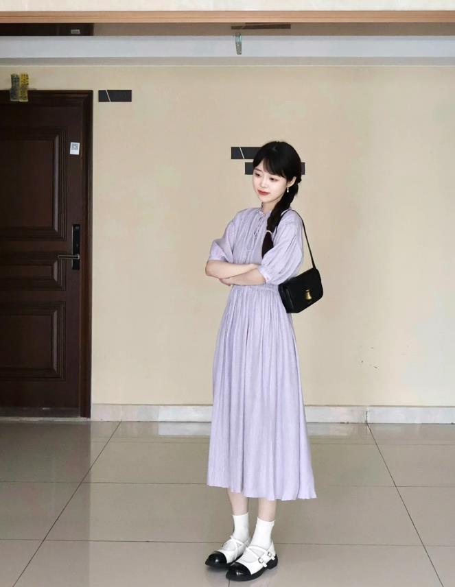真的很喜歡紫色啊,不要覺得自己的膚色駕馭不了紫色,其實,只要你選擇低飽和度的配色就行了,淺淺的紫色調,可太顯白和溫柔了。鬆緊腰的設計,修飾身材又顯瘦,搭配一雙瑪麗珍單鞋,也太溫柔氣質了。