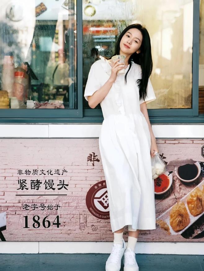白月光裙有多大吸引力,怕也只有嘗試過才知道吧,這麼一條白色連衣裙,穿起來也太氣質了,很乾淨清爽的顏色,夏季裏穿上最合適了。搭配一雙白色運動鞋,與裙子同色的組合,讓整個造型更和諧。