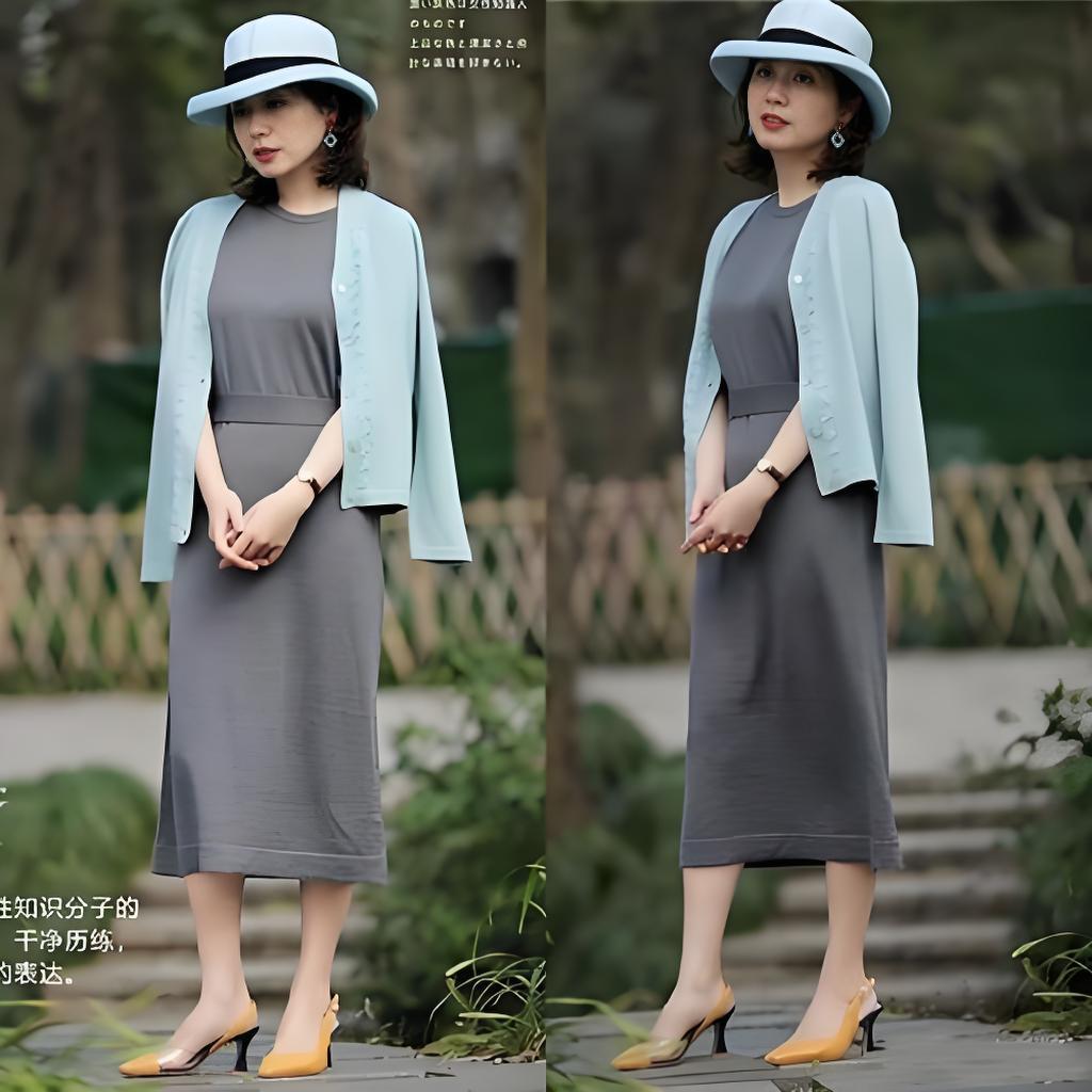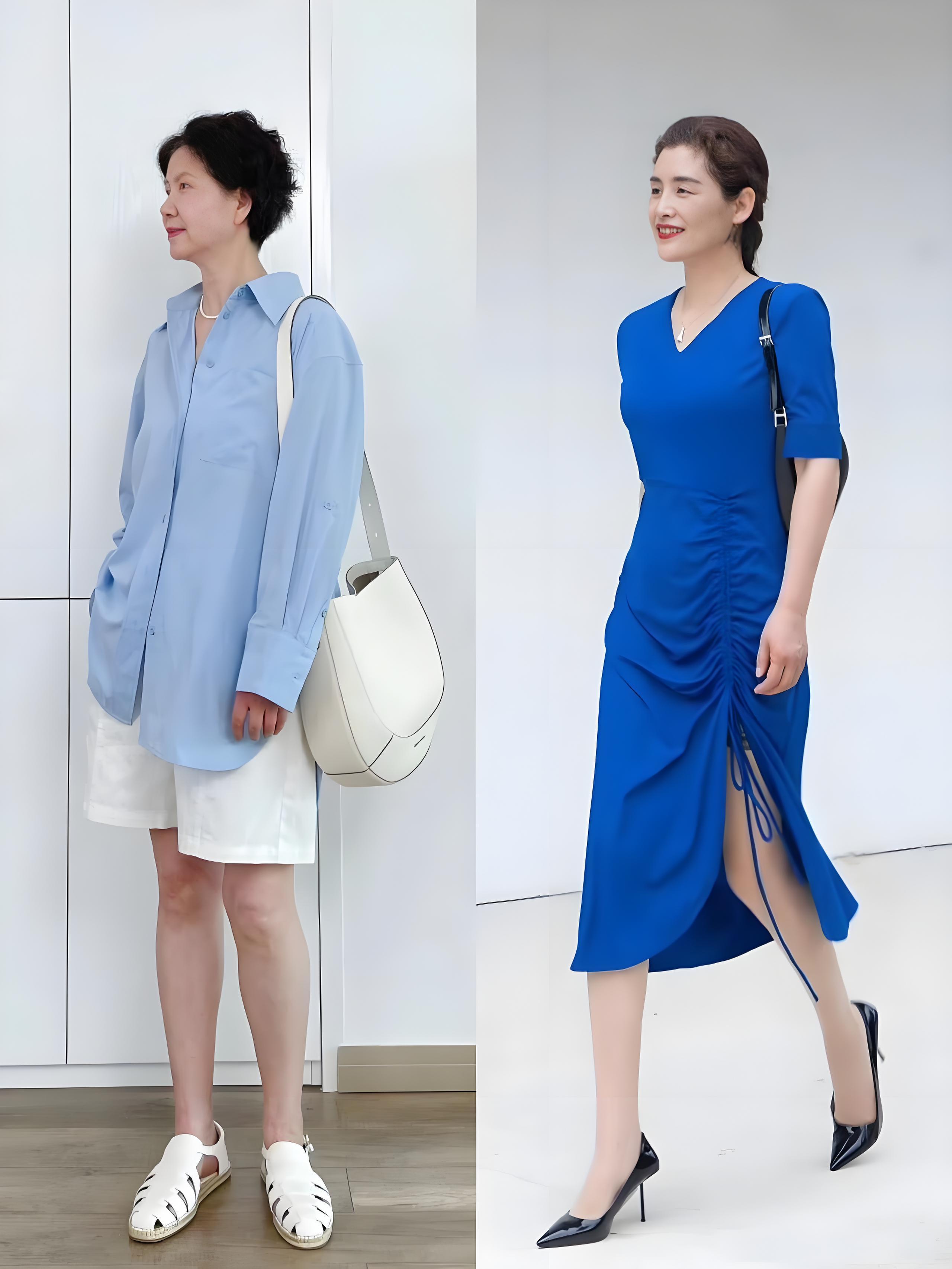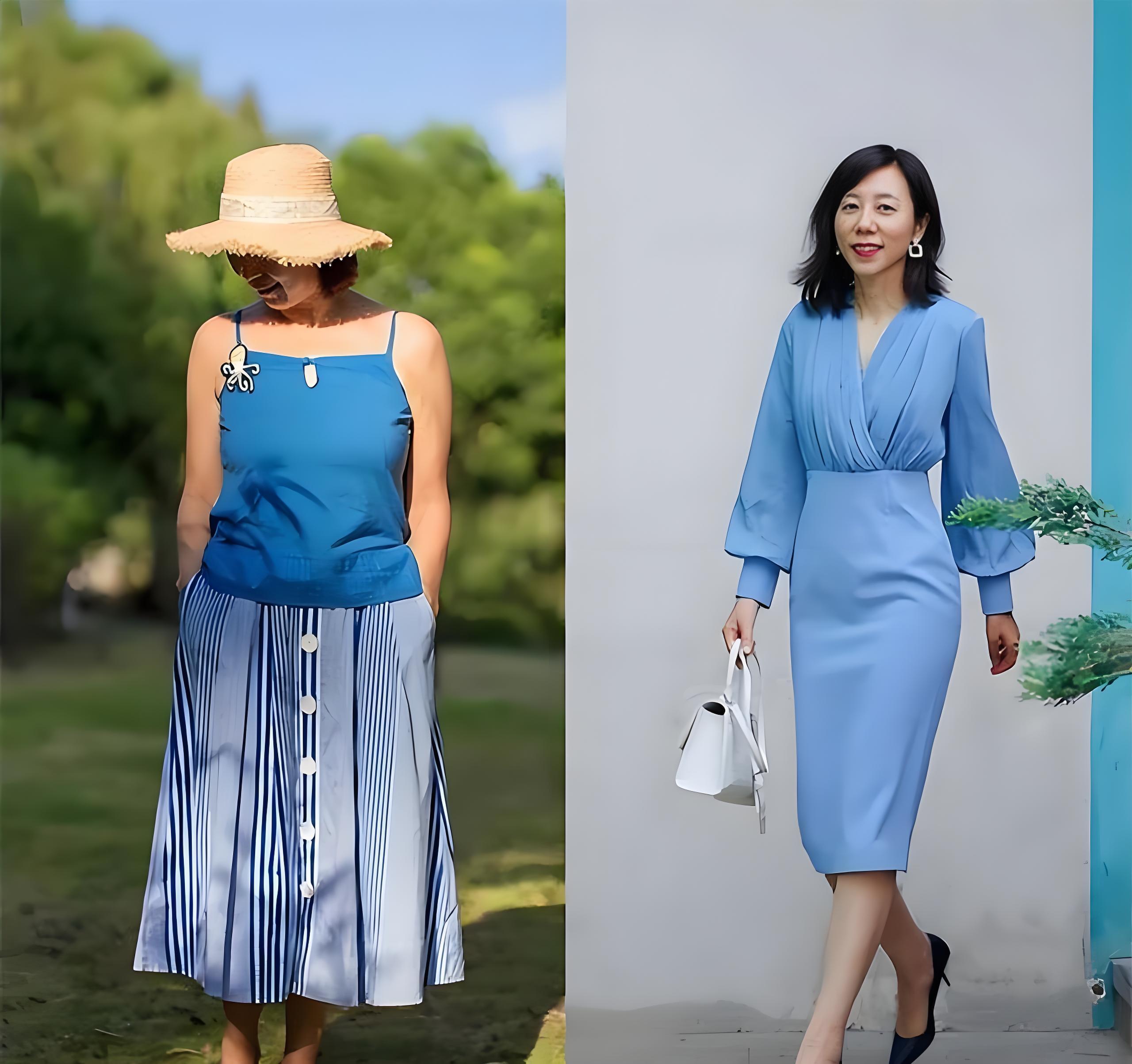 乾淨又顯白的藍色系,對於大齡女性真的很友好。哪怕是有點發福的身材,也可以穿出高級貴氣感。