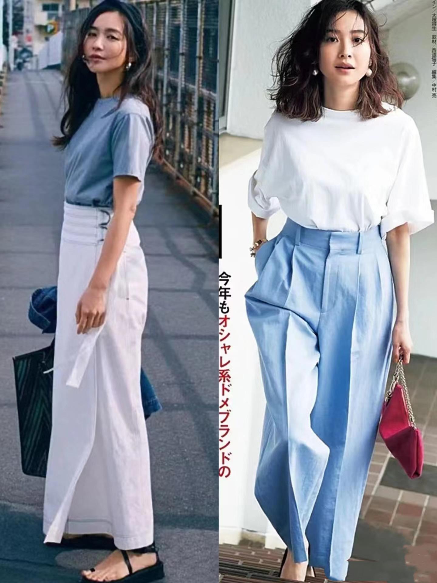 夏天裏的高腰褲/高腰半身裙,都可以更好的優化我們的身材比例。穿寬鬆的襯衫,配高腰的長褲/半身裙,抬高視覺中心、擁有大長腿的即視感。