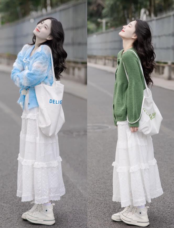 柔軟舒適的針織小開衫,最適合初秋季節穿了,不薄不厚的,應對微涼的早秋正合適,選擇一條白色半身長裙來配,真的太美了,一整個鬆弛和隨性,也很溫柔。不管是逛街還是約會,這麼穿都是非常不錯的。