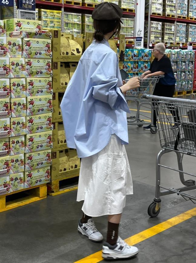 低飽和度的藍色襯衫,真的太襯膚色和顯白了,寬鬆的版型加持下,感覺什麼樣的身材都是可以穿的,藏肉更顯瘦。下身選擇一條白色不對稱半身長裙來配吧,藍白搭配也太清爽好看了。