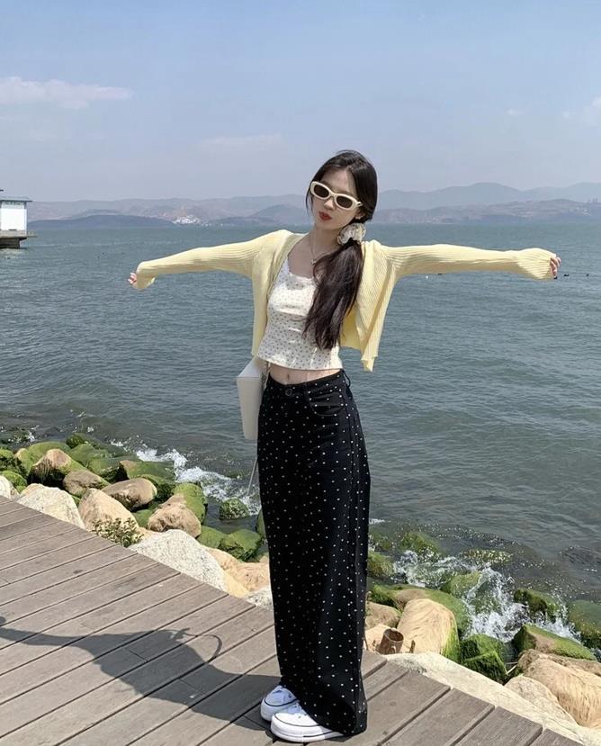 韓範十足的一套穿搭,薄款針織小開衫,顏色是很溫柔顯白的奶黃色,第一就被這個色調吸引住了,裏面配了件碎花吊帶背心,再搭配一條波點闊腿褲,整個穿搭看起來又甜又辣的,真的太愛了。