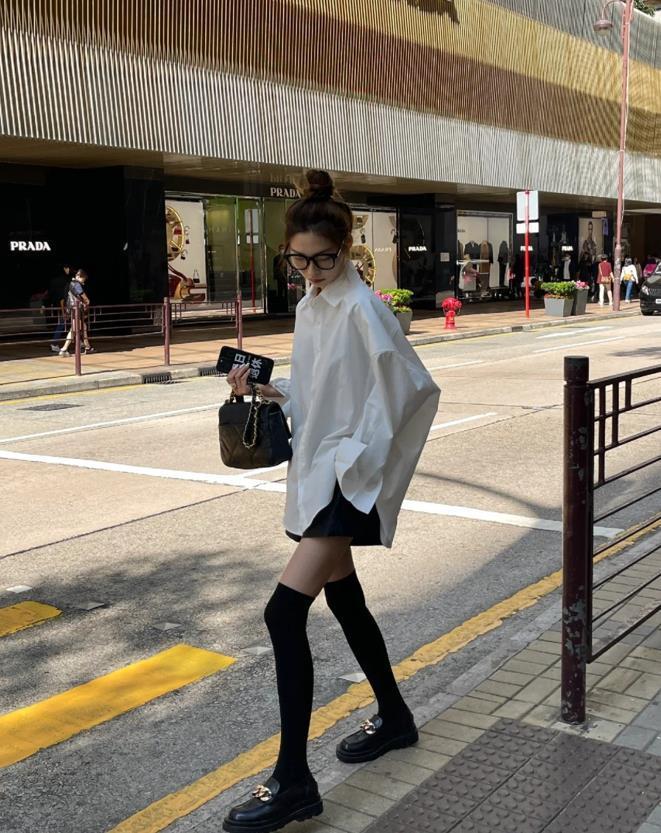 經典的白襯衫,也是衣櫥裏最不可缺的單品之一,在早秋,可以給自己入手一件長袖的白襯衫,記得版型選擇寬鬆些的,這樣穿起來才更藏肉顯瘦,也很舒適自在。選擇黑色休閒短褲,再利用一雙黑色長襪子進行點綴,增加造型層次感,也不失時髦。