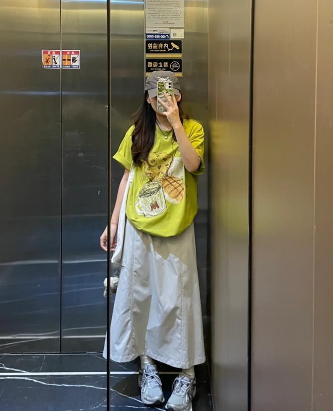 可上班通勤,也可以逛街度假,這麼一套休閒風的穿搭,看起來也太時髦了,熒光綠的短袖t恤,很吸睛洋氣。寬鬆的版型,也太藏肉顯瘦和舒適了,下身配一條淺色半身長裙,加上一雙運動鞋後,就有種毫不費力穿出時髦和活力。