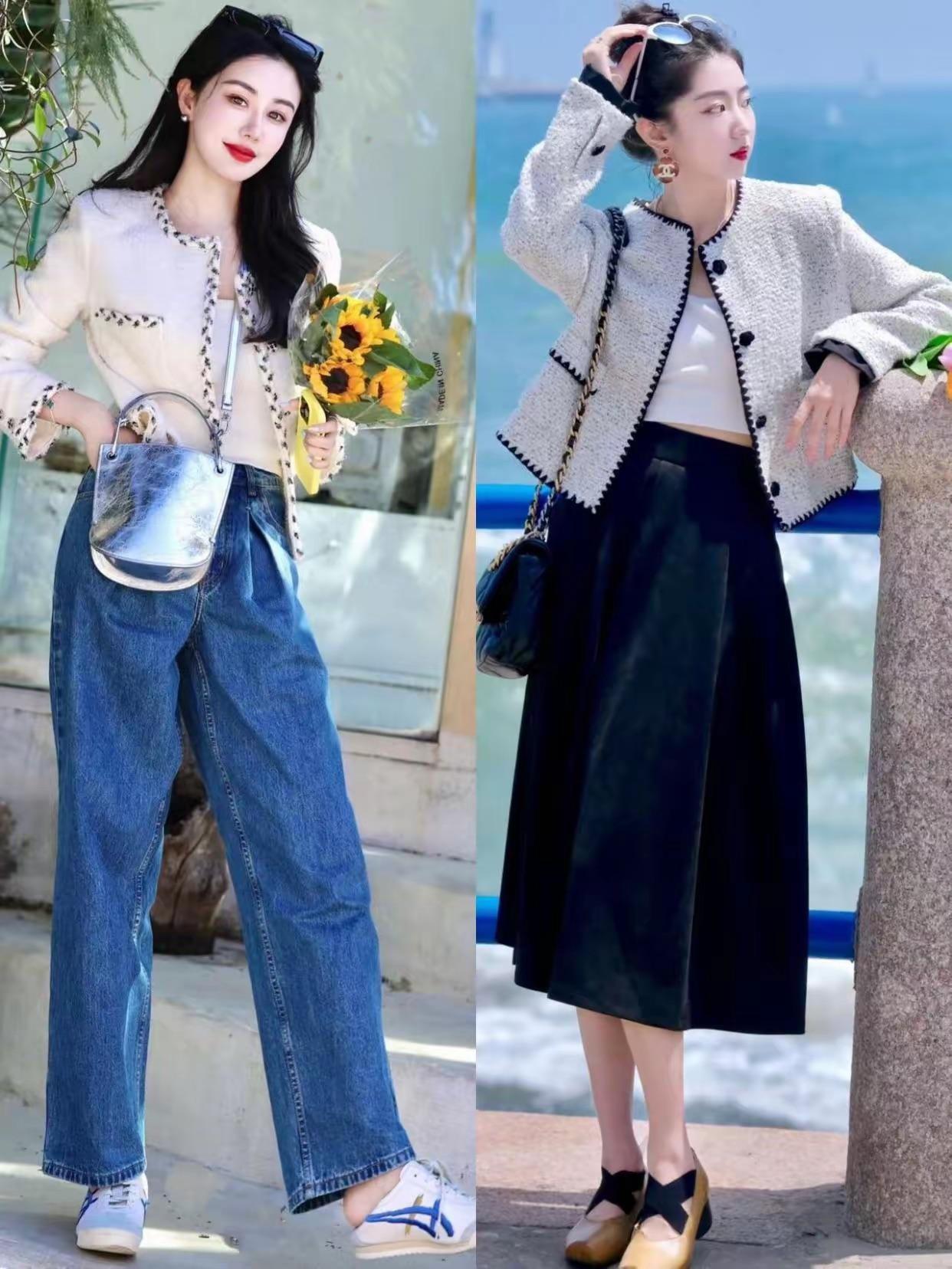 短款的小香風外套,不管是配直筒牛仔褲、還是A字形的半身裙,都可以抬高腰線、充分顯高。看似簡潔的穿搭,也杜絕了視覺上的凌亂繁瑣。