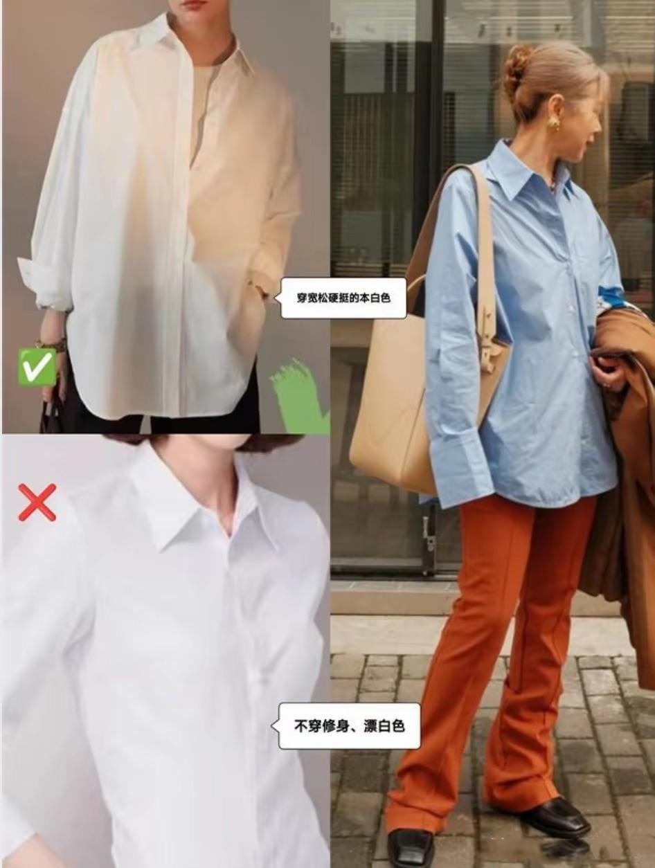 我們可以嘗試搭配適當寬鬆一點的襯衫,比如H型線條的襯衫、可以選擇白色系或者藍色系,乾淨美好,也可以在一定程度上弱化年齡感。