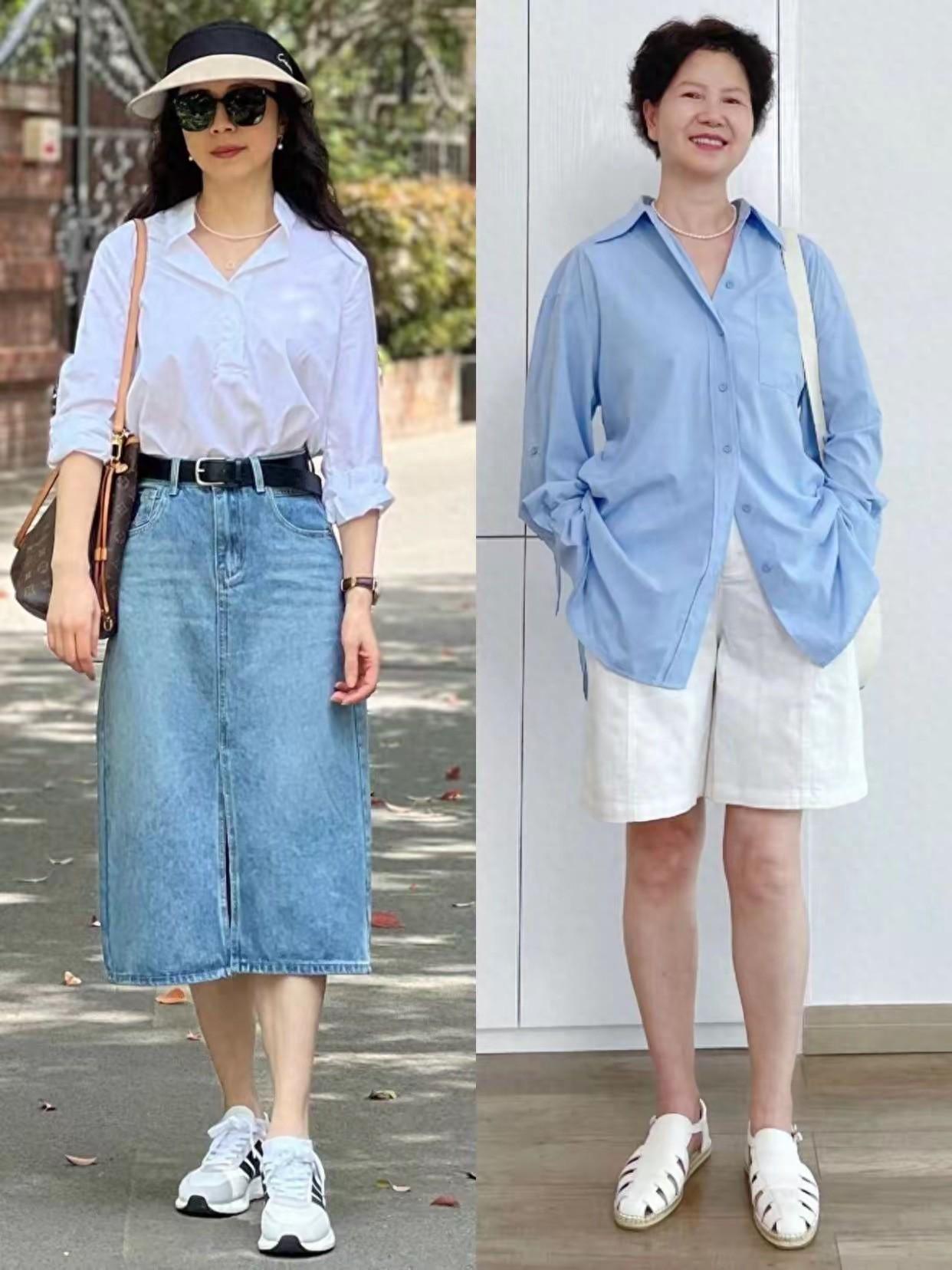 寬鬆的白襯衫、或者天藍色襯衫,看似款式基礎、實則清爽耐看。爲什麼城市阿姨的穿搭毫不油膩?不過是懂得穿搭的技巧罷了。