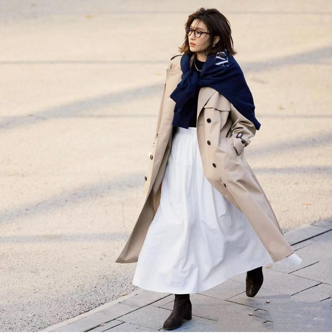 經典的卡其色風衣,我們可以配淺色系、也可以配深色系。深色系卡其色風衣,配黑色半身裙,就酷颯拉風。淺色系風衣,配白色半身裙,就更加溫柔知性。