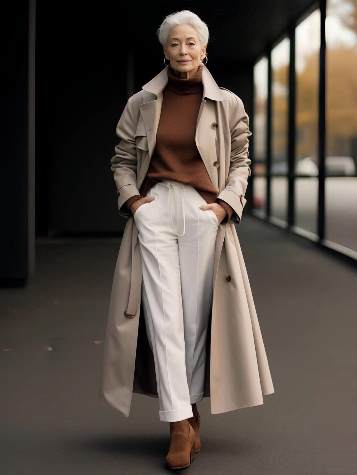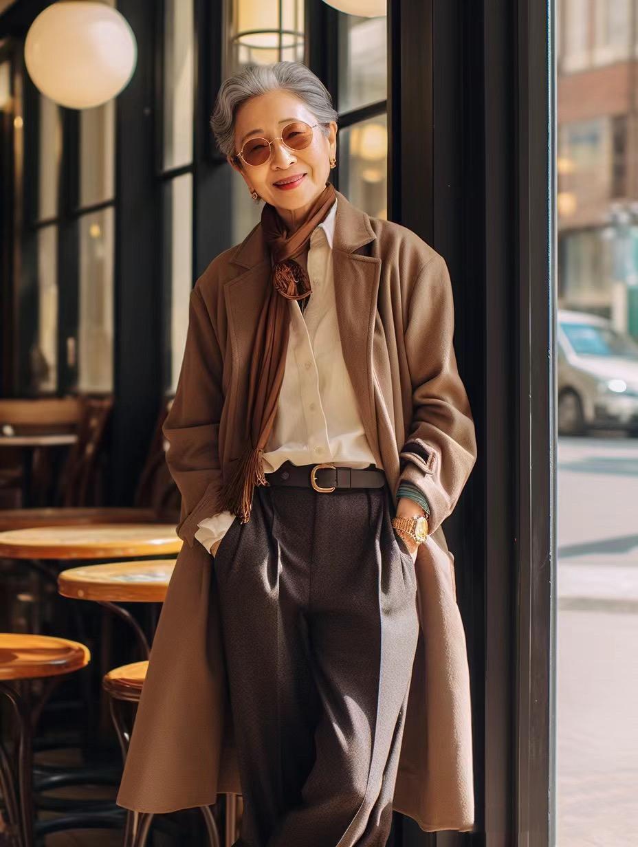 高飽和度的大地色,更適合大齡女性,即便是頭髮斑白,依然可以穿上風衣、酷颯時髦。