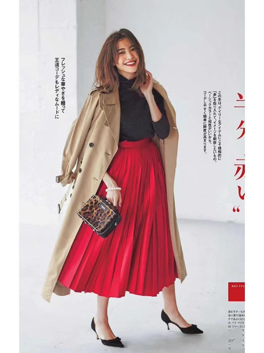 一襲紅色半身裙,穿在身上浪漫醒目,配尖頭的黑色高跟鞋、顯得小腿更筆直了。