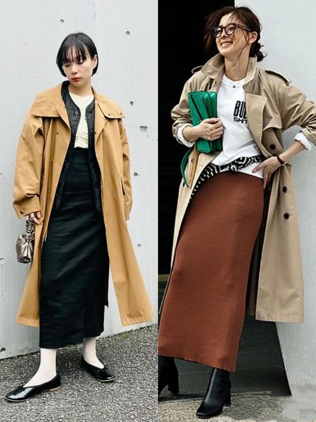 寬鬆風衣外套,配緊身的半身裙,穿上身更時髦提氣質,修身半身裙的搭配、也可以顯得下半身更纖細一些。
