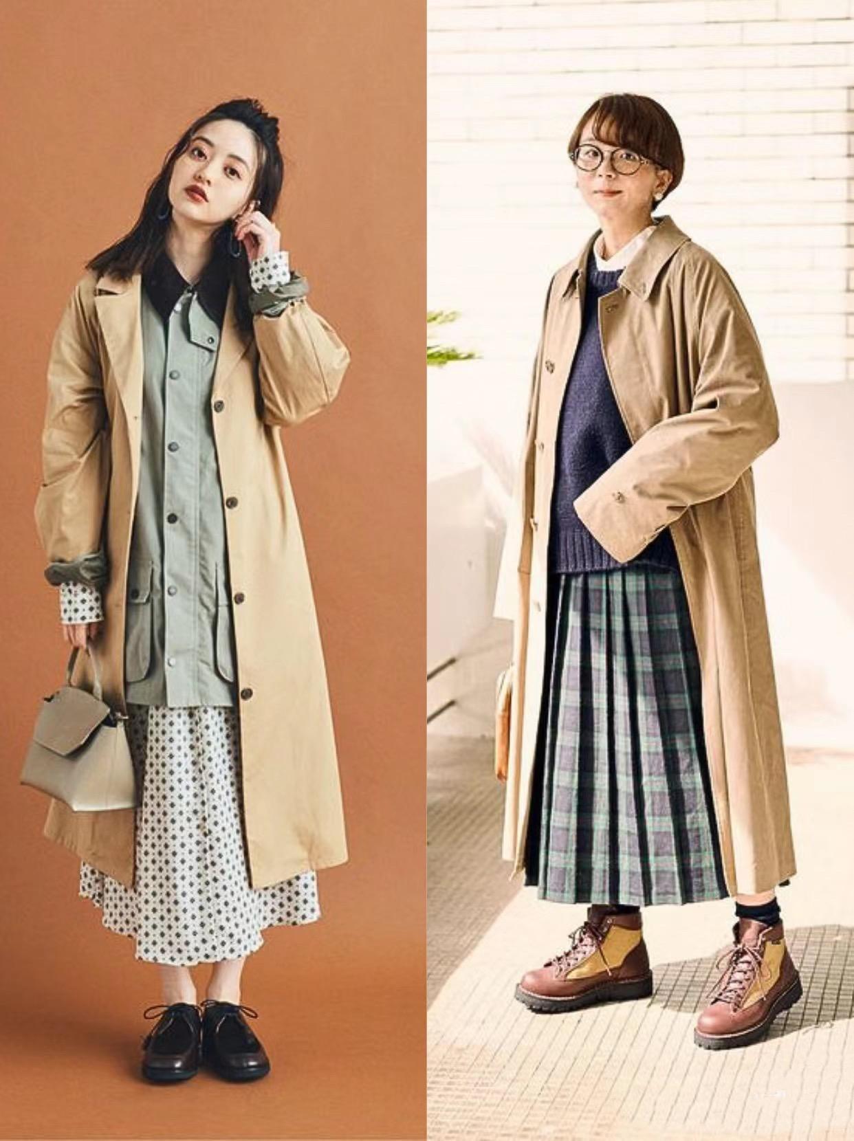 文藝復古風的卡其色風衣,自然是與文藝範的半身裙、厚底樂福鞋更配呀。