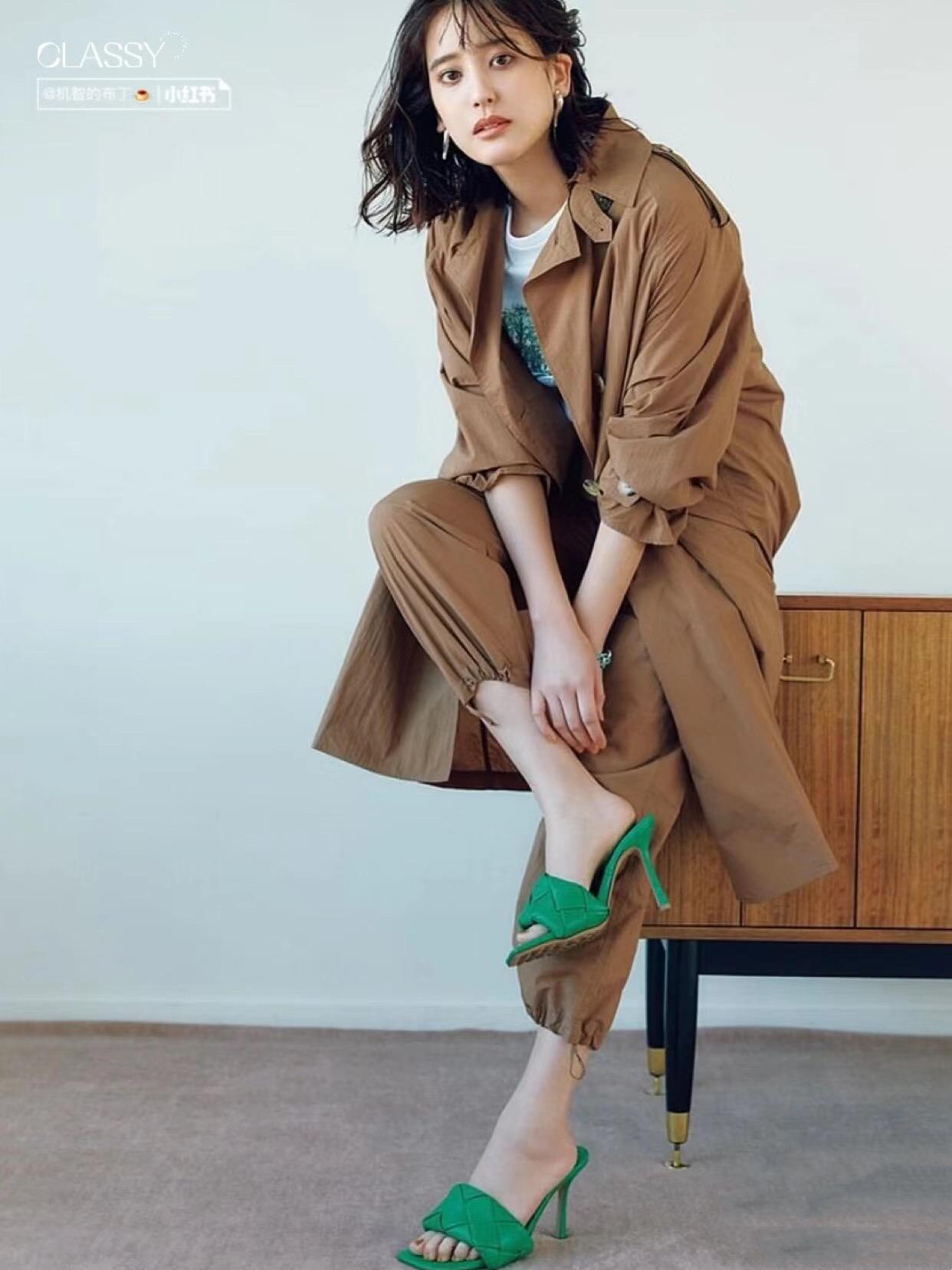 面料輕薄的大地色風衣,可以配同款同色系的九分束腳褲,搭一雙墨綠色高跟鞋,時髦醒目還顯膚白。
