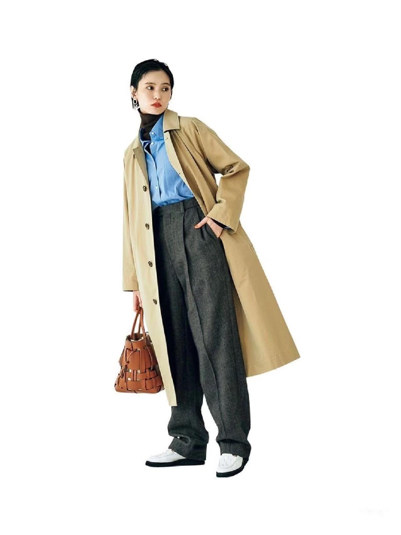 選擇大地色風衣的時候,也可以匹配稍微厚實一點的面料。