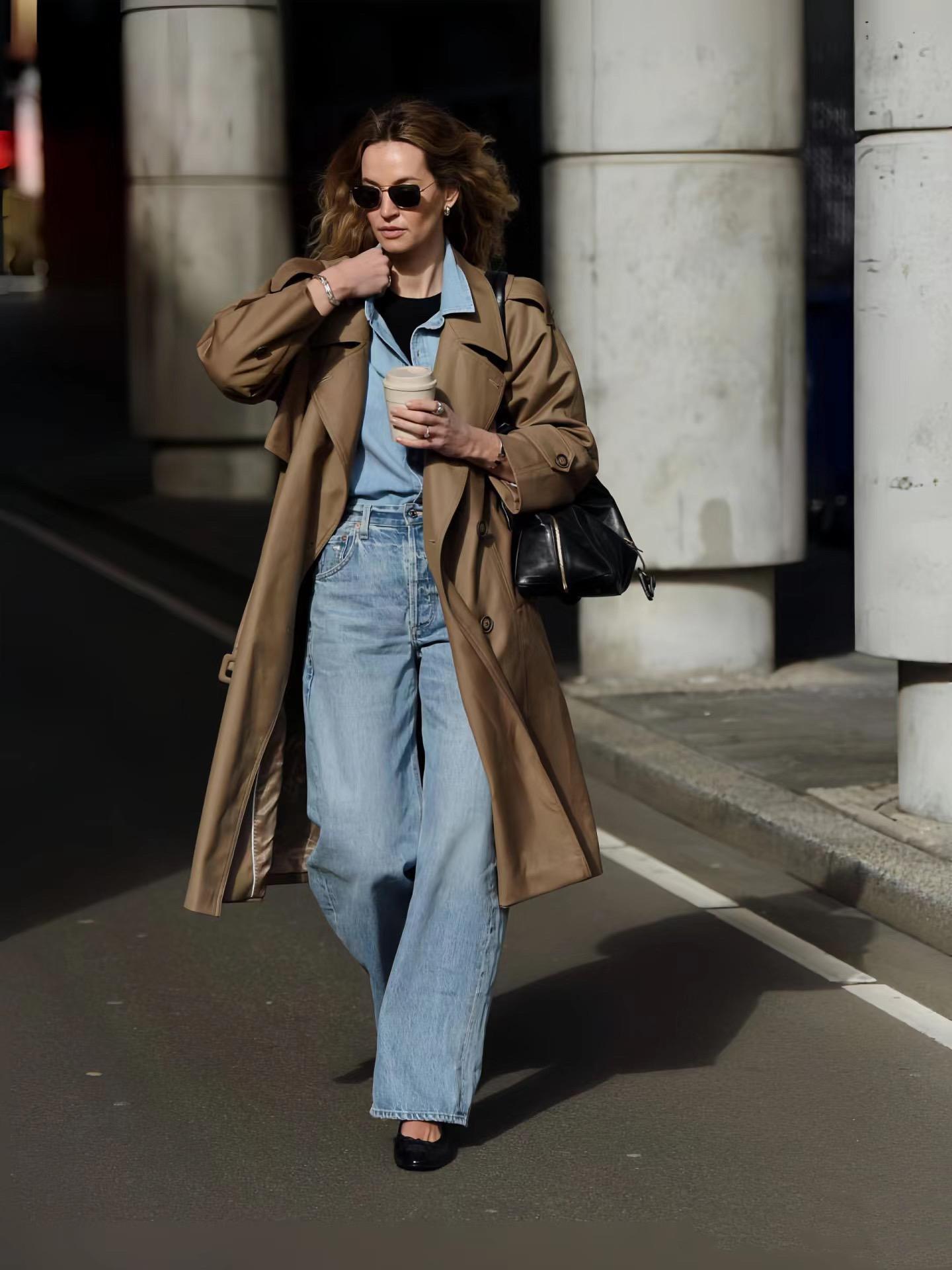 隨着天氣轉涼,輕薄面料的大地色風衣,也可以與牛仔襯衫、打底衫進行疊穿。