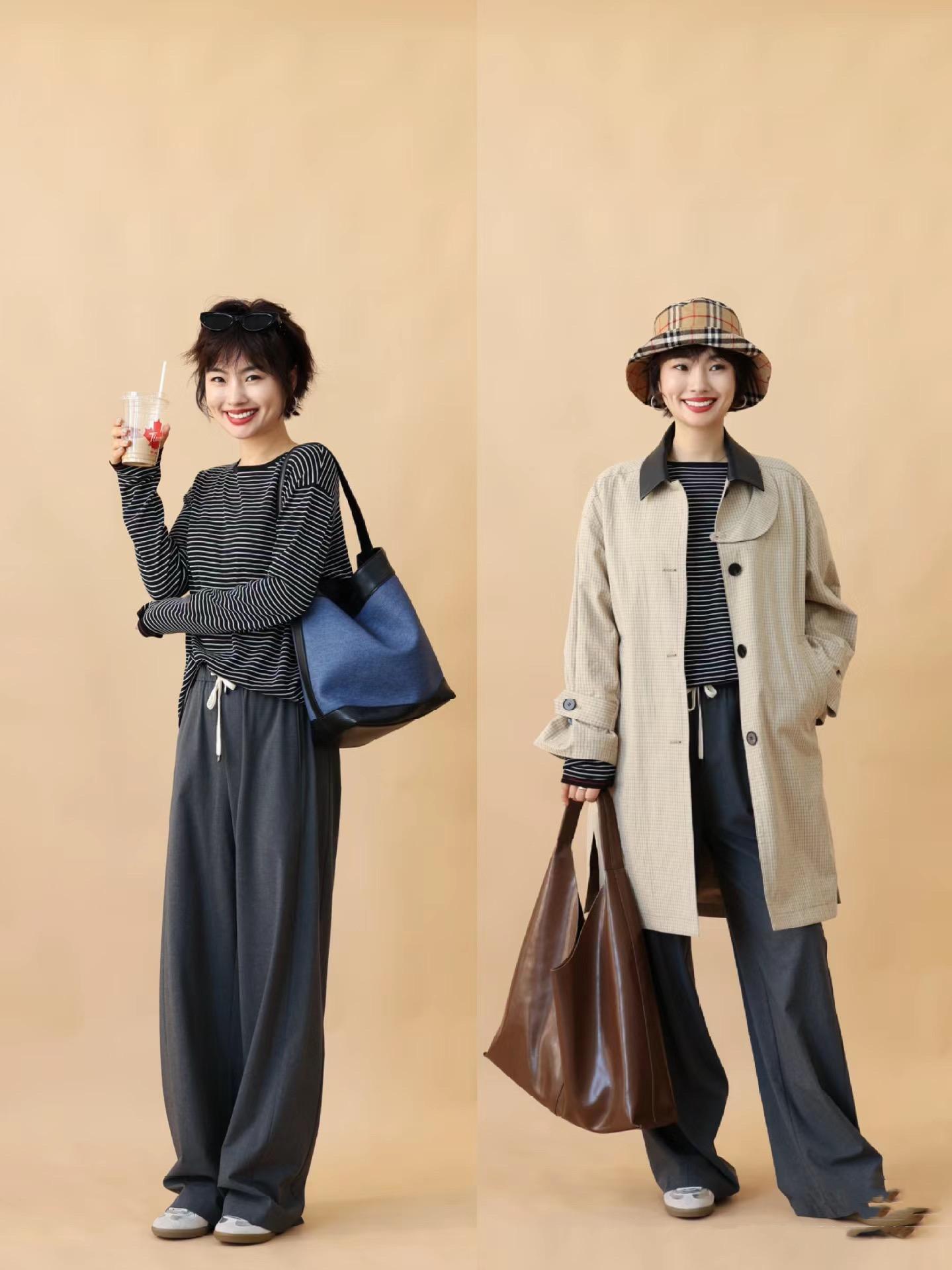 像這種簡單的條紋打底衫,可以配高腰的直筒褲穿着,條紋打底衫,自然塞一個衣角,就很顯高也很利落。