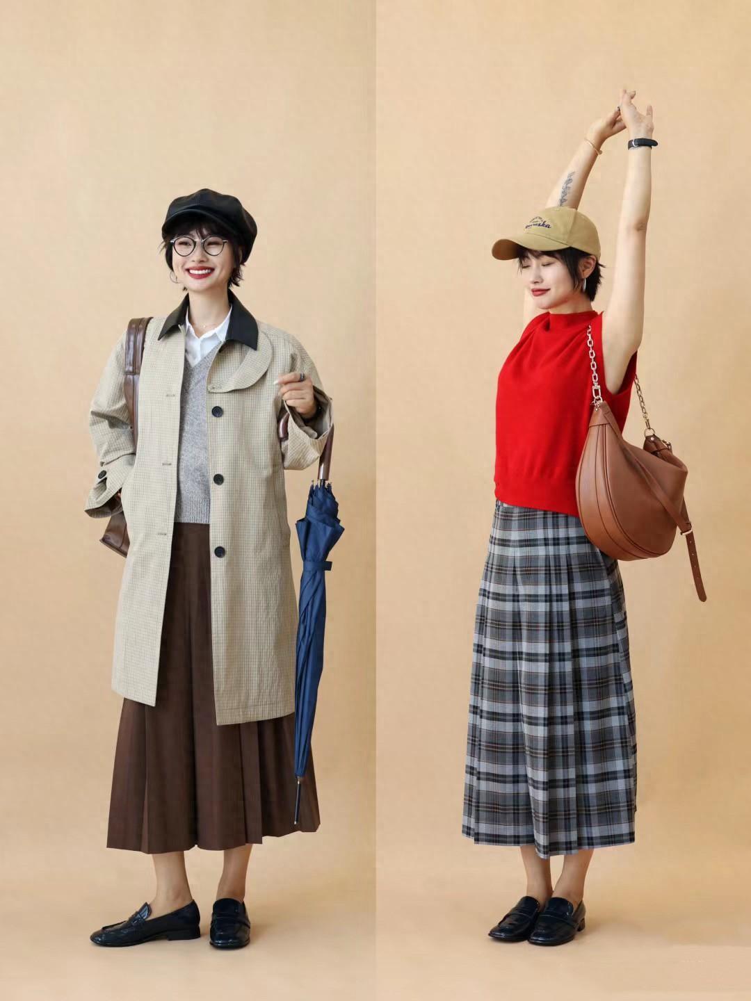 文藝復古風的穿搭,也是蠻顯氣質的。黑色打底衫,格子半身裙,灰色系的西服外套,擁有主編氣質,也適合上班穿着。