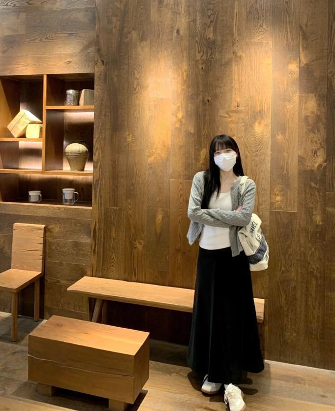 不管在什麼時候,黑色半身長裙都是很受歡迎的,經典的黑色半身長裙,怎麼搭配都可以,裙子的版型是有些偏傘字形狀的,具有極佳的修身效果。上衣配一件灰色針織小開衫,灰黑配色,簡單耐看又舒服。