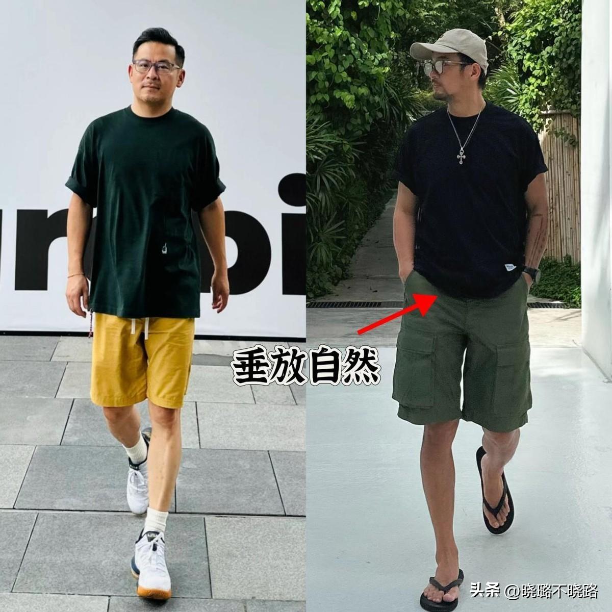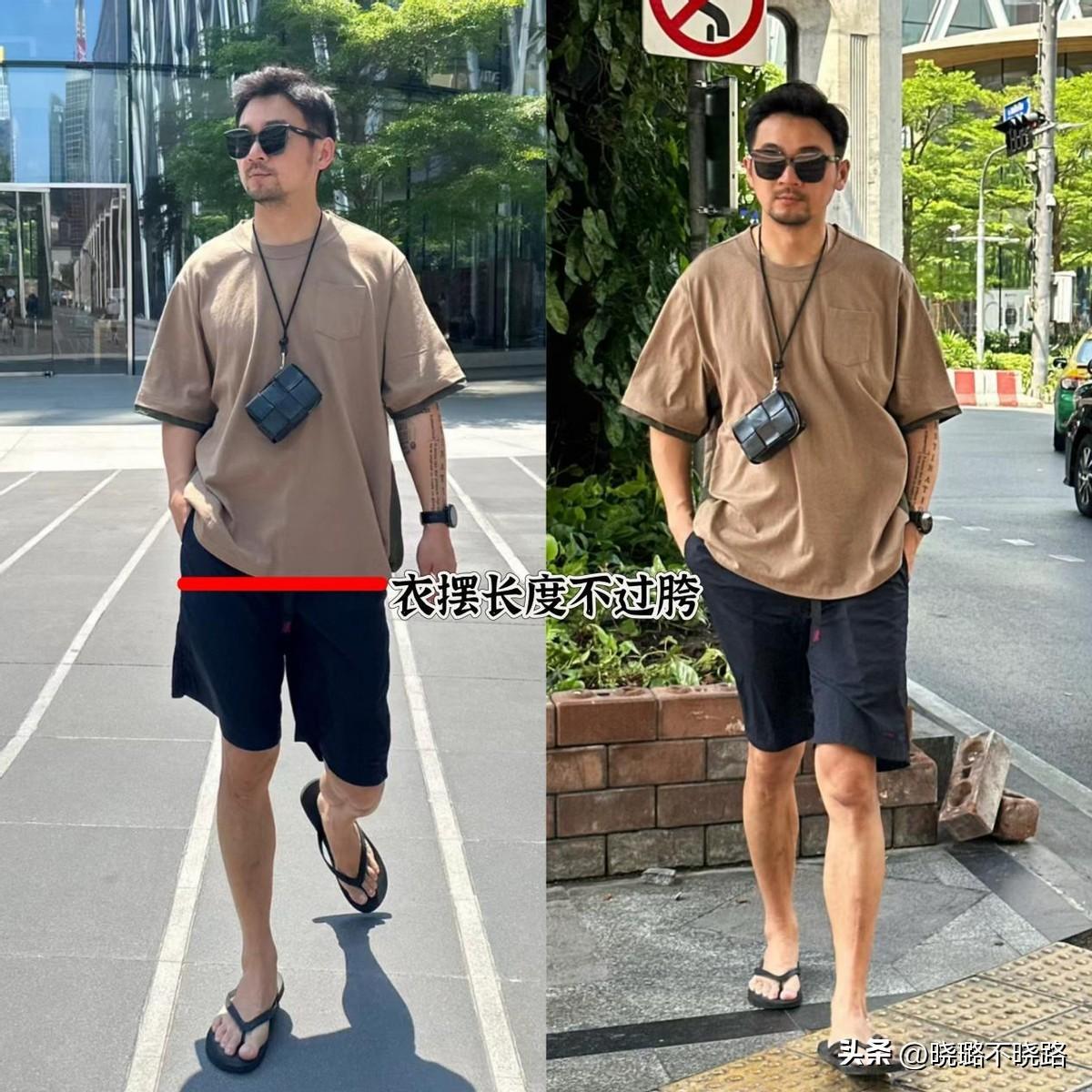 其實只要上衣選對了,就可以解決80%的搭配難題,也不用刻意的“塞衣角”分割比例。在日常生活當中,最常見的就是T恤,建議中年男人可以選擇一件衣襬不過胯的寬鬆T恤。