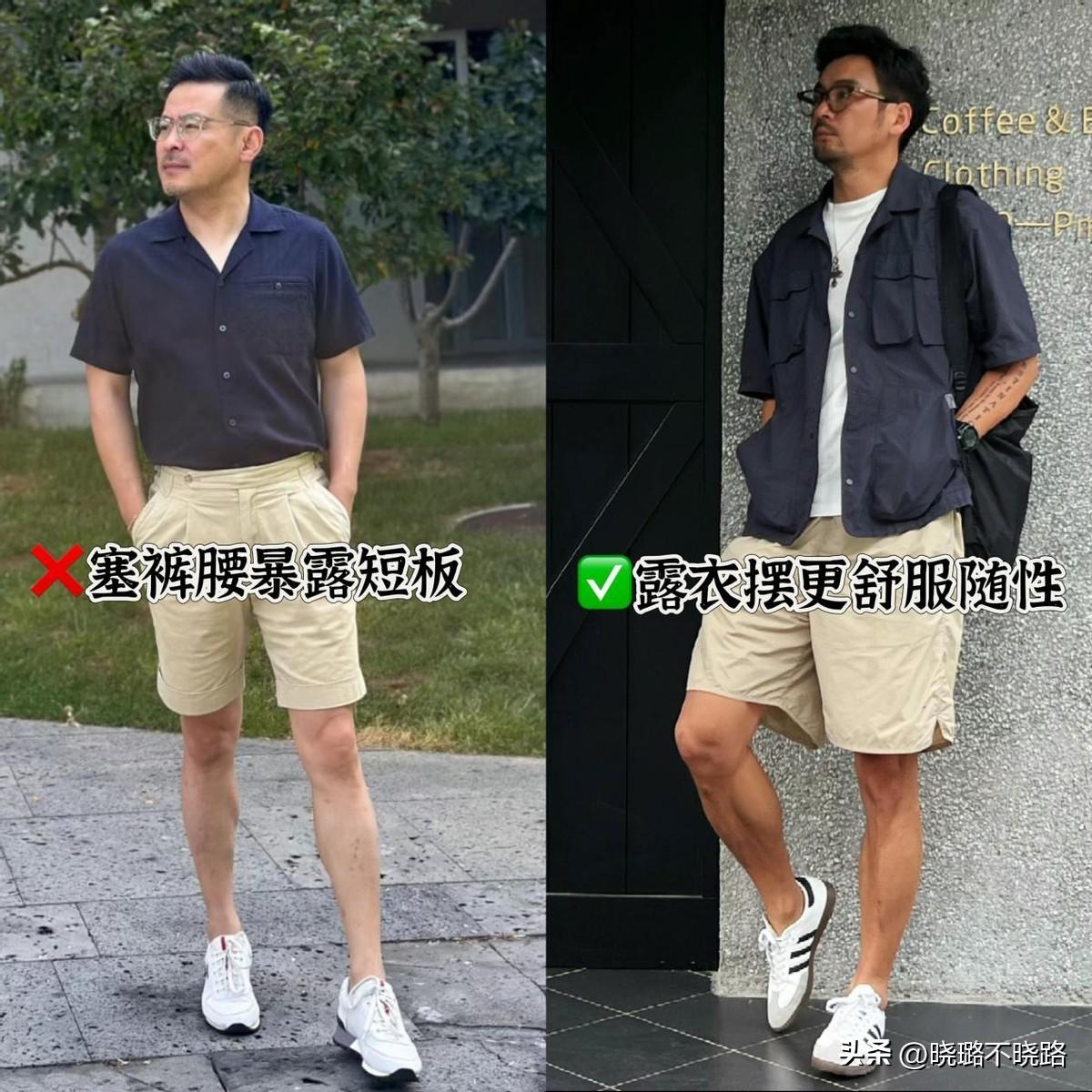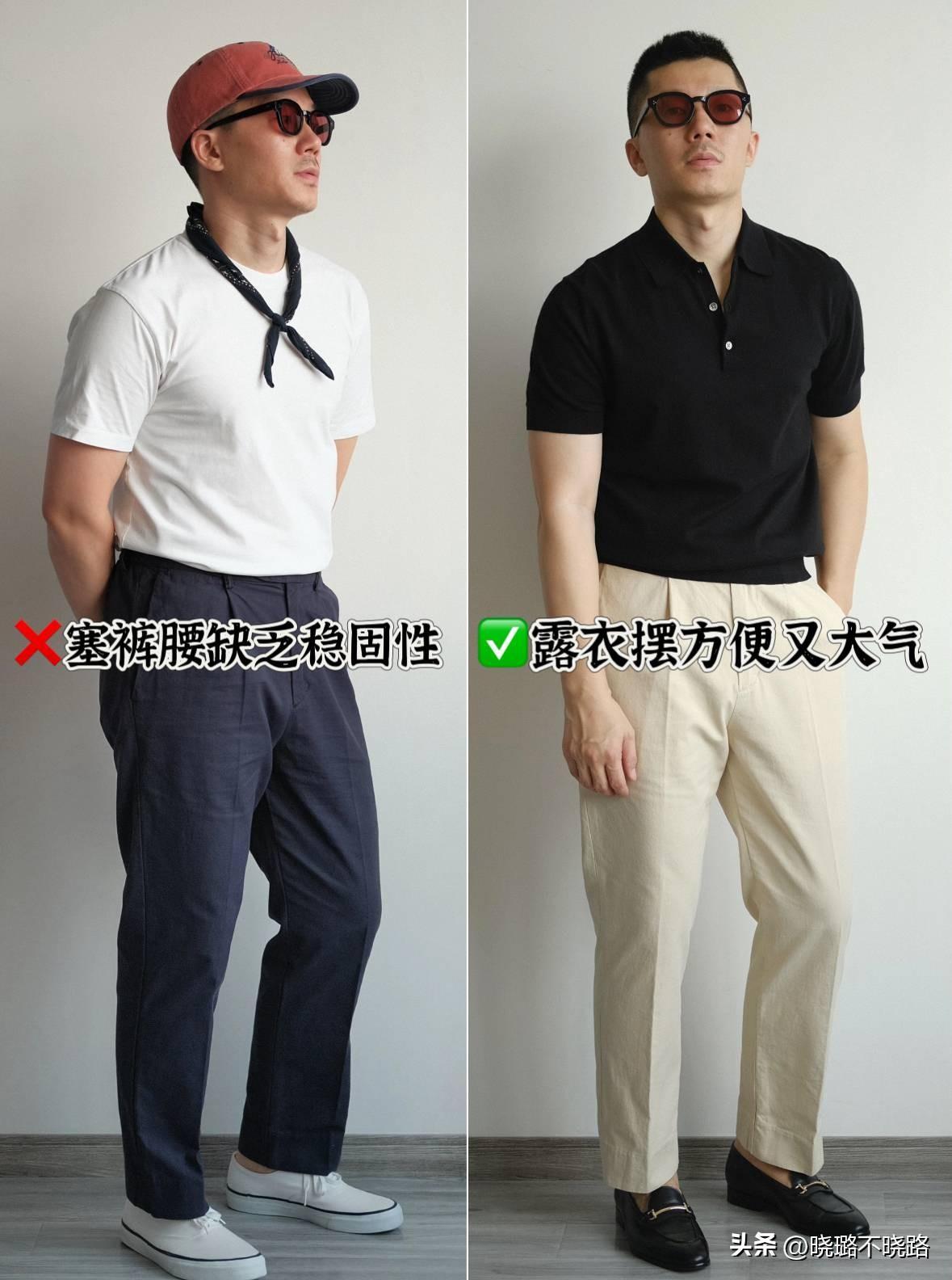 將衣角全部塞進褲腰當中之後,可以讓啤酒肚更加明顯,在視覺上還非常顯胖,對於身材比例差的男士來說,還很容易穿出五五分的現象,倒不如選擇合適的上衣,不塞衣角也顯高。