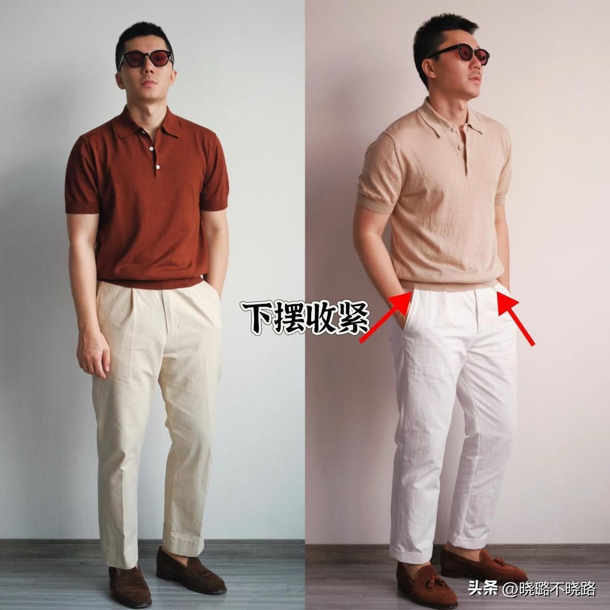 如果想要明示出腰部線條,並且分割完美的身材比例,那麼,上衣的版型就不能太寬鬆,千萬別輕易嘗試oversize的款式,換成下襬收緊設計的針織POLO衫,帶點修身設計更顯瘦。