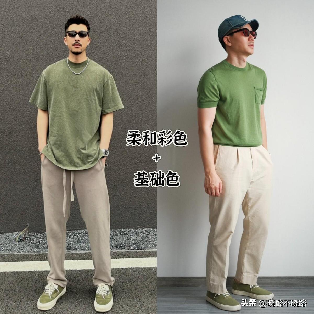 分割身材比例的方法有很多種,除了“上衣塞褲腰”以外,其實還可以通過色彩進行對比,例如,上衣可以選擇比較柔和淡雅的彩色系,活力感十足的牛油果綠,顯擺襯膚又很減齡。