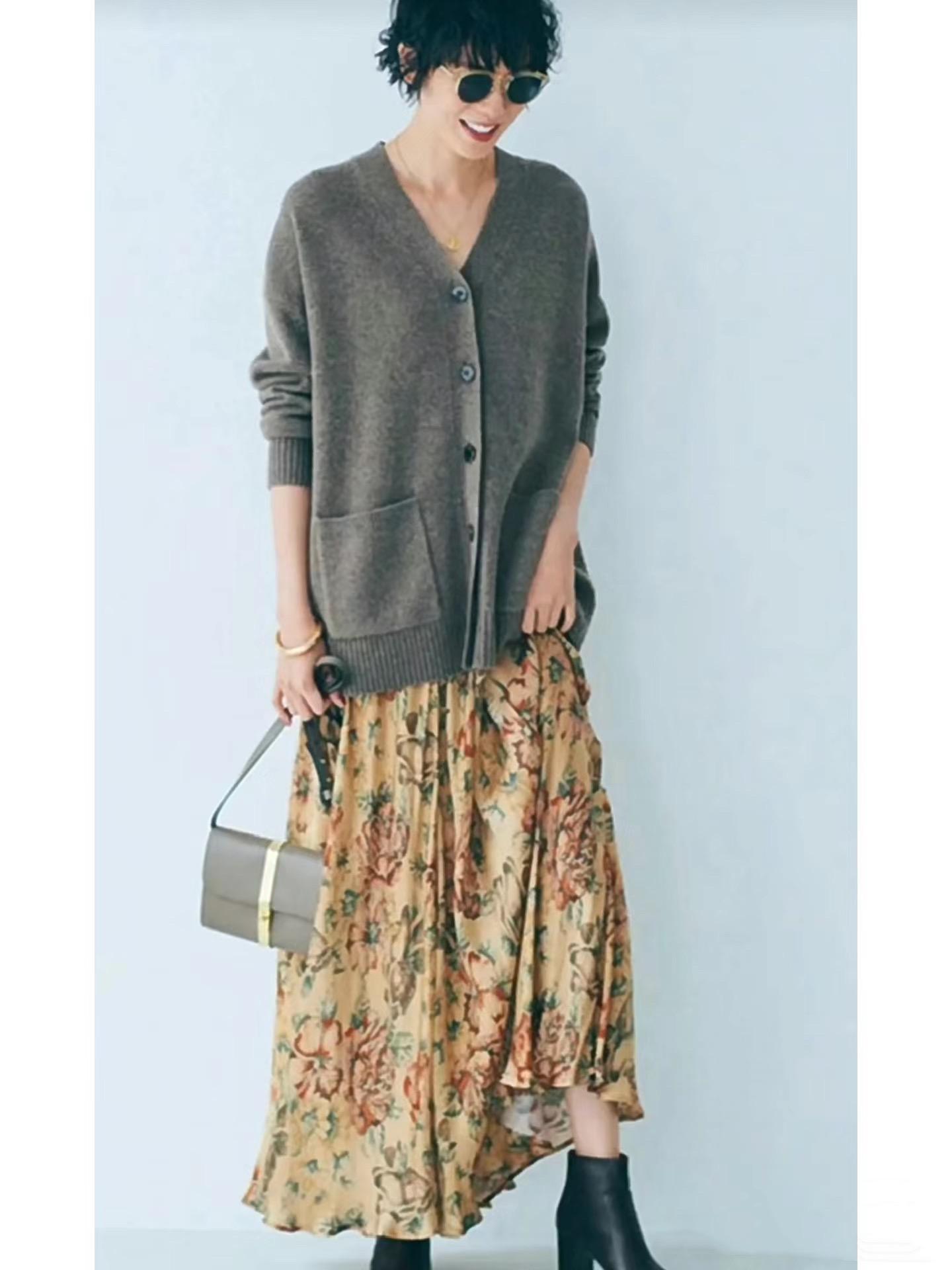 輕薄的印花裙,飄逸的裙襬浪漫且溫柔。如果擔心花色有點複雜,就配純色系的針織開衫吧。比如這件灰色針織開衫,既溫柔又大方。