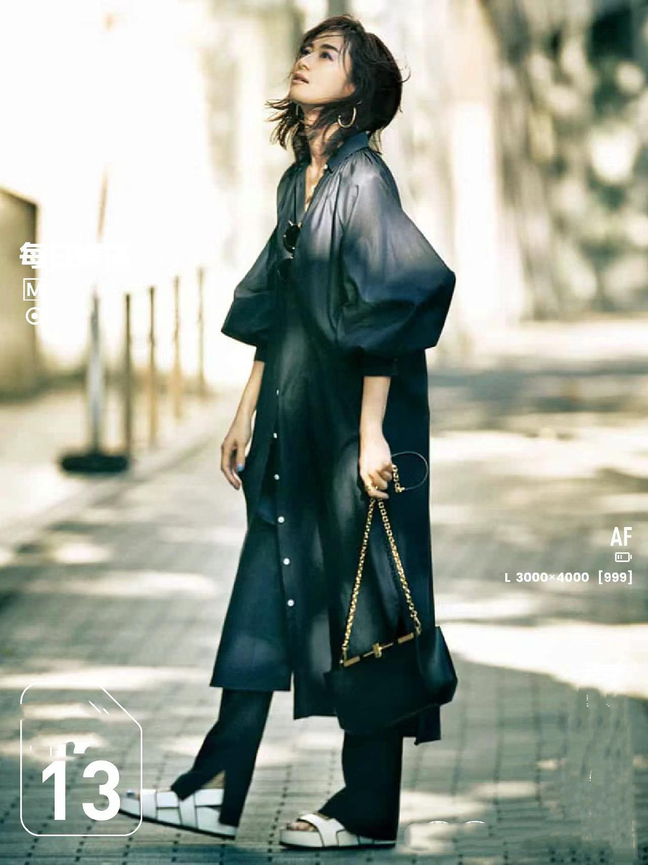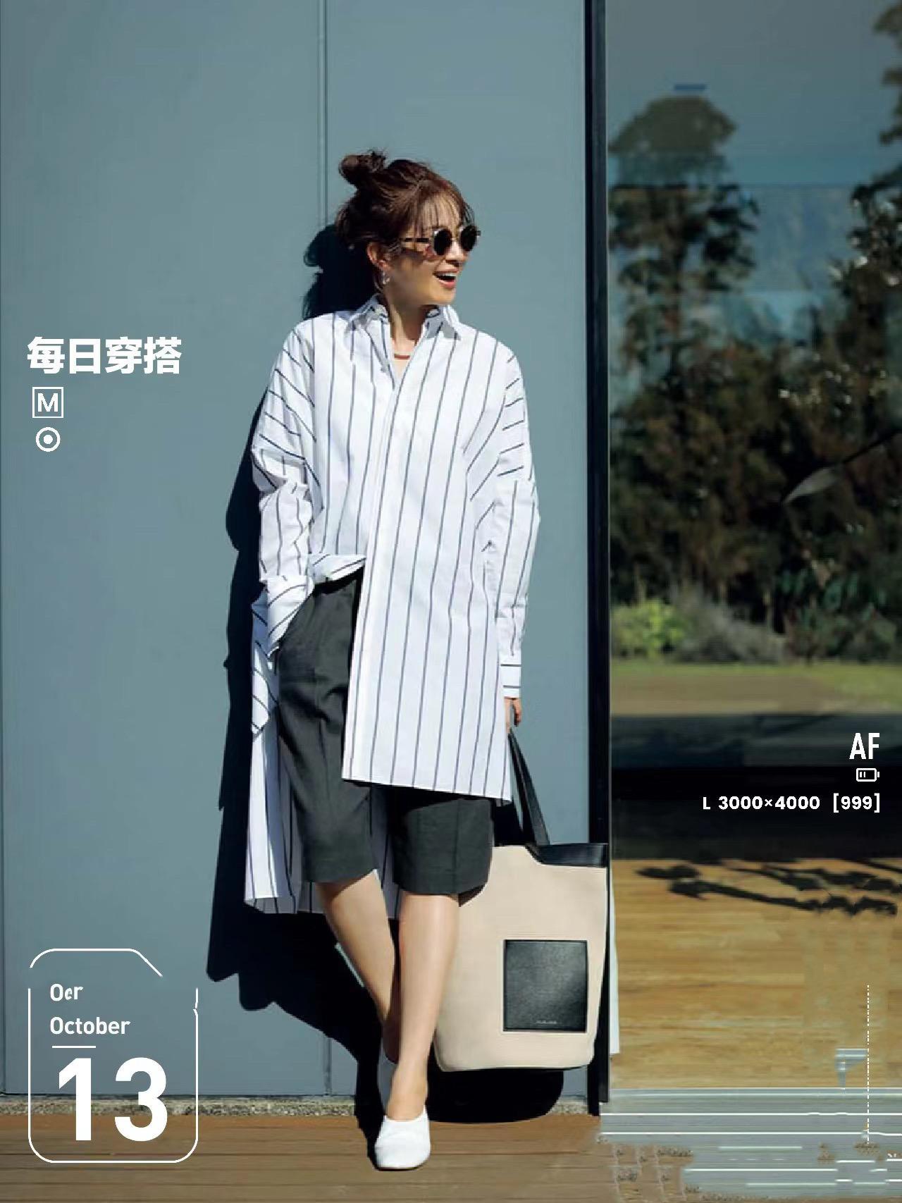 寬鬆的襯衫裙,高腰線、大裙襬,告別了往日乏味。用寬鬆襯衫裙來搭配九分牛仔褲,屬於色彩清爽的疊搭,瞬間有了秋高氣爽的氛圍。