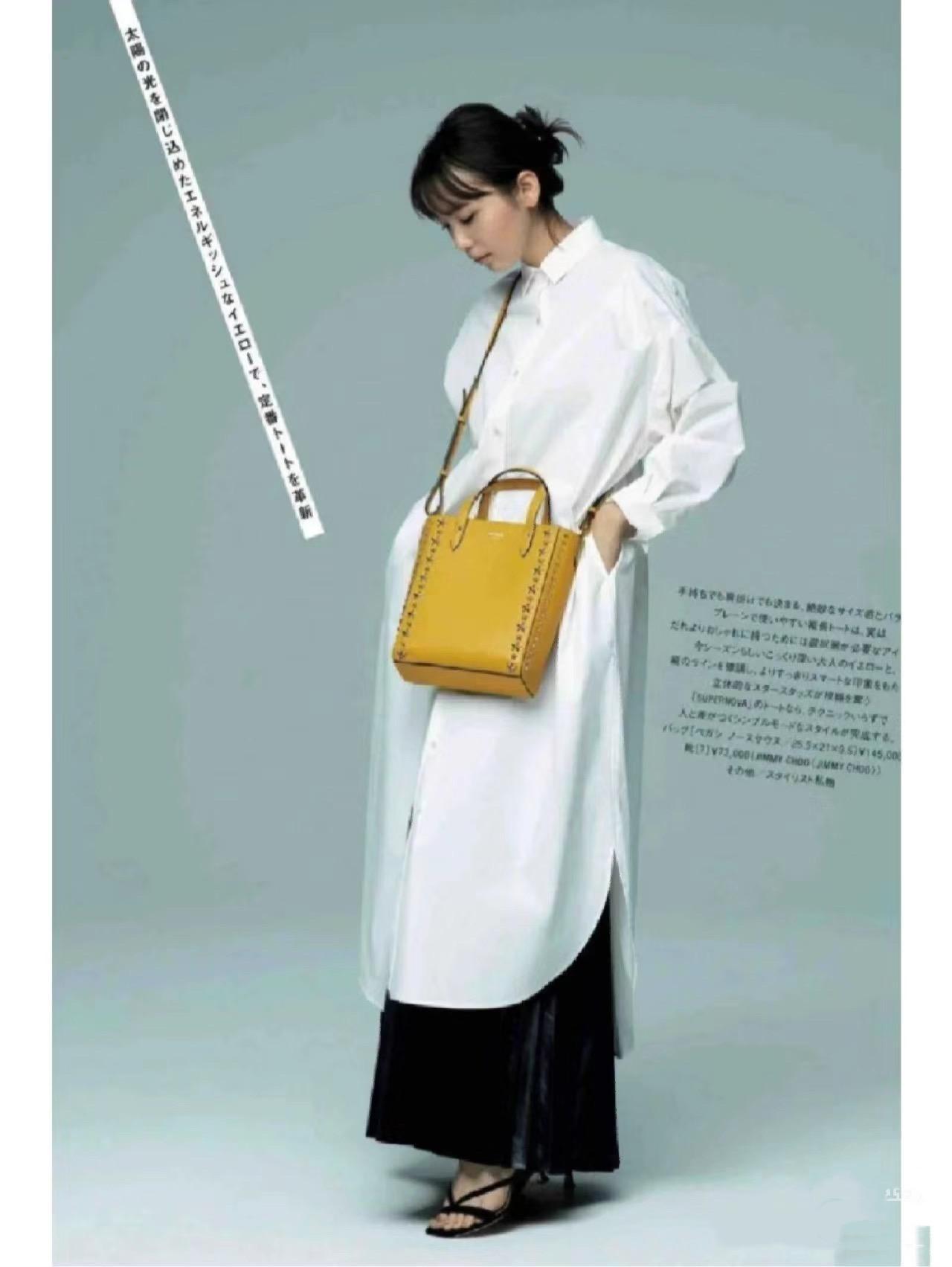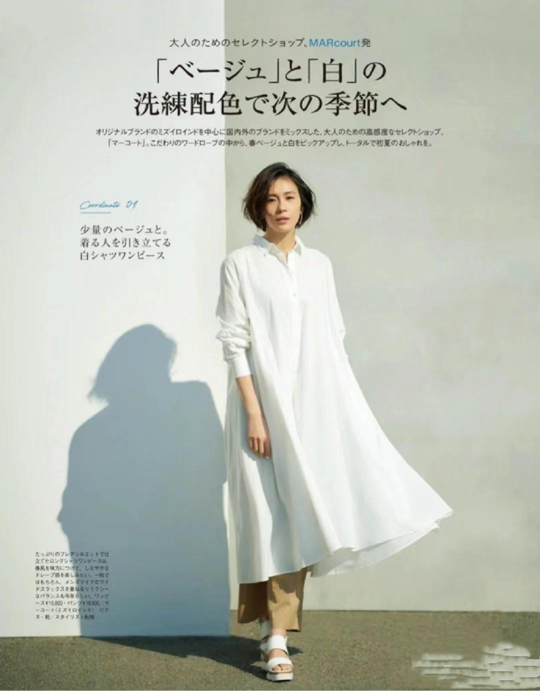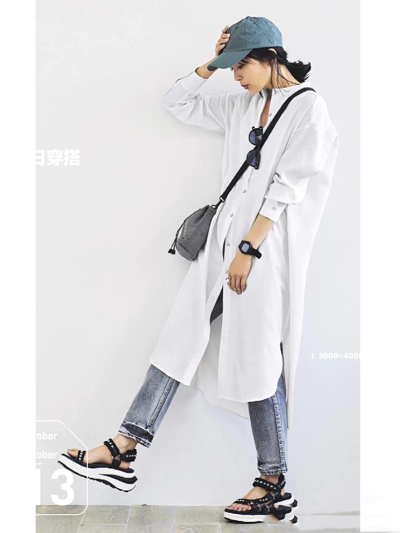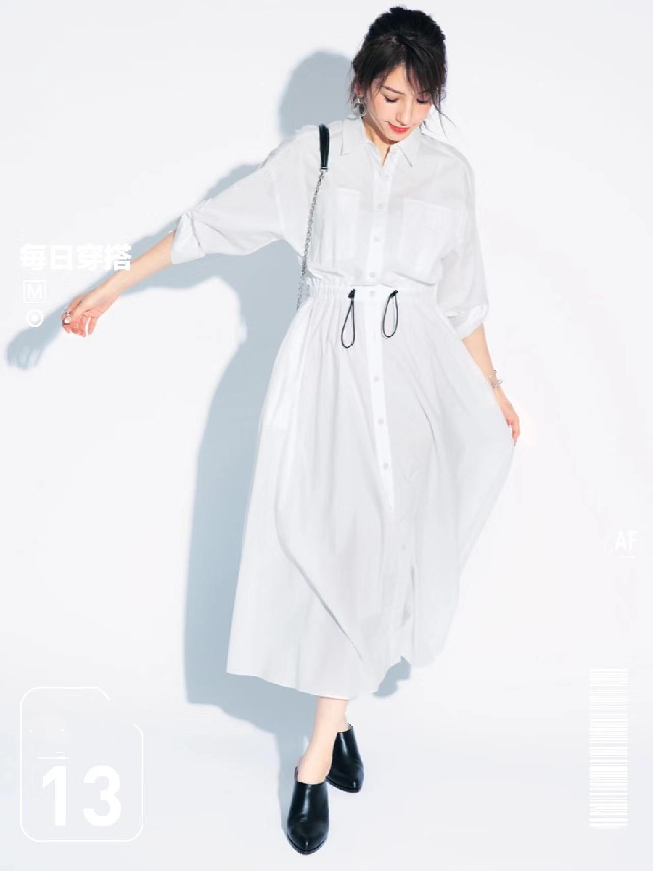 A字形剪裁,大裙襬的白色襯衫裙,讓我們的穿搭變的更從容。白色襯衫裙+卡其色九分褲,擁有成熟女性的內斂,更加大方時尚。